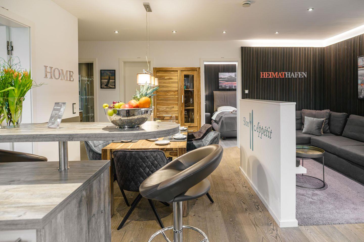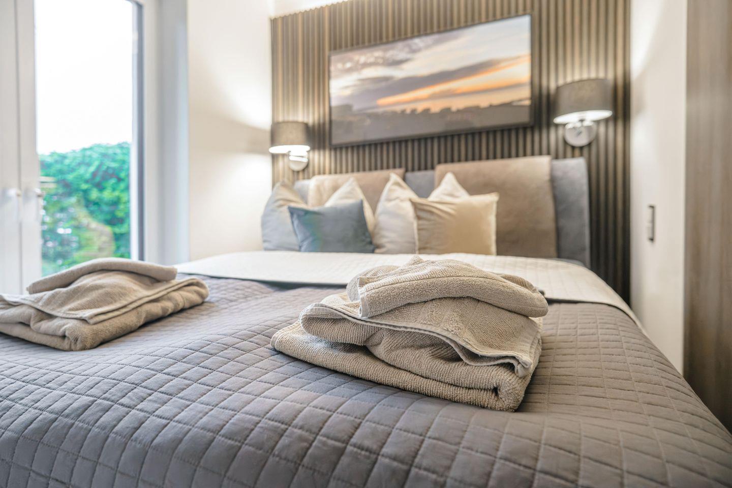 Im Erdgeschoss befinden sich die Ferienwohnungen Welle und Muschel. Sie sind jeweils 65 qm groß, für bis zu sechs Personen konzipiert und zeichnen sich durch ihre helle Gestaltung, den Echtholz-Parkettboden mit integrierter Fußbodenheizung und ihre ebenso gemütliche wie stilvolle Einrichtung aus.