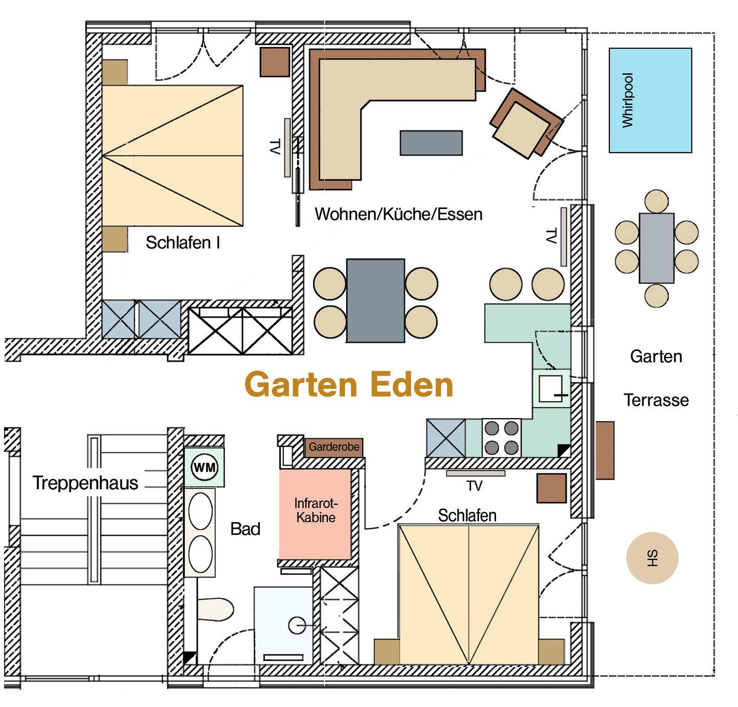 Die Ferienwohnung „Garten Eden“ befindet sich im Erdgeschoss und bietet einen direkten Zugang zu einem kleinen Paradies – einem 300 qm großen Garten zum Spielen, Essen und Relaxen. Die Wohnung ist ca. 66 qm groß, gewohnt hell und freundlich gestaltet und ist für bis zu sechs Personen konzipiert. Ausgestattet mit einer eigenen Infrarotkabine lädt auch das stilvoll gestaltete Duschbad dazu ein, die Seele einfach weiter baumeln zu lassen.