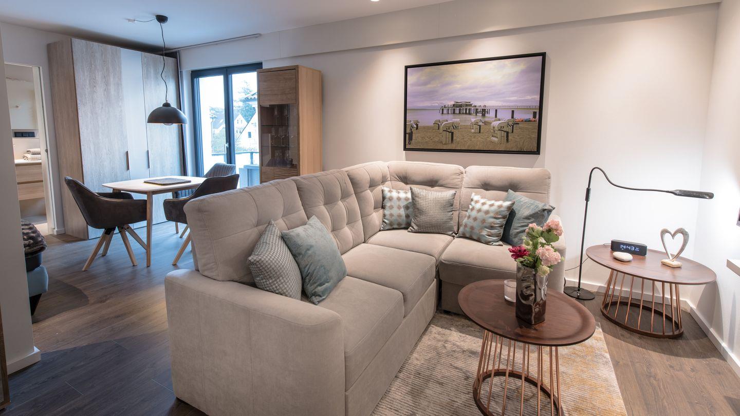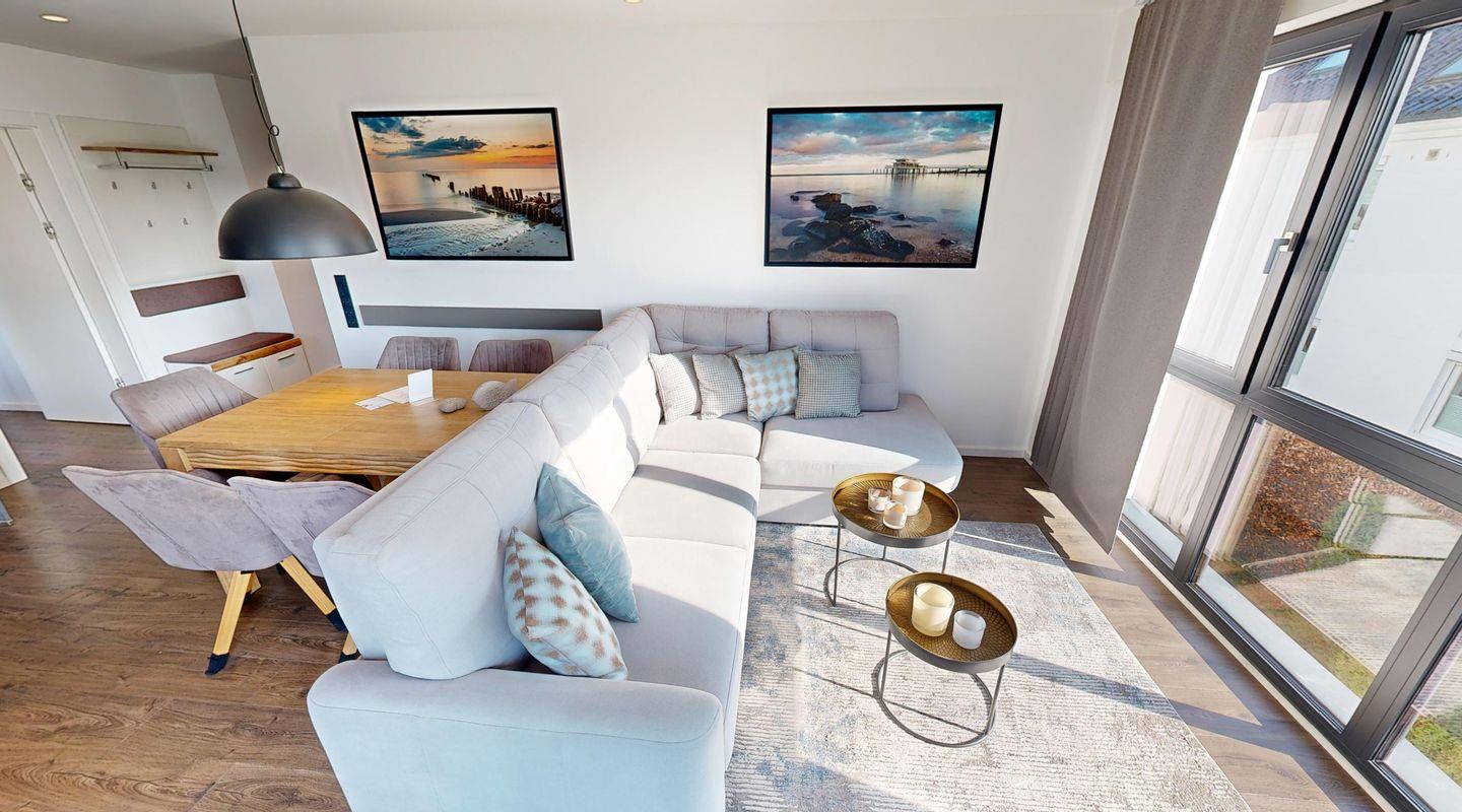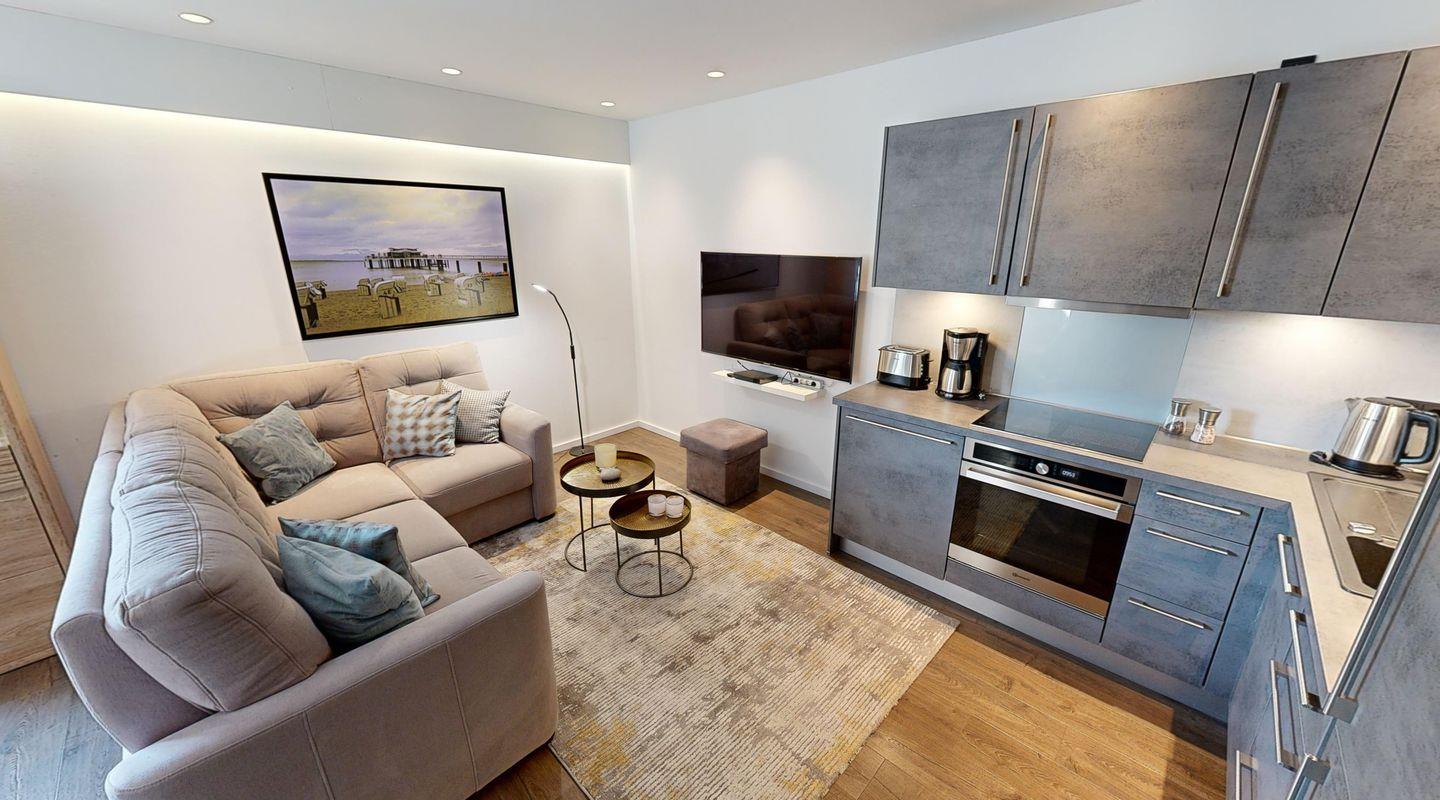 Auch die Ferienwohnung „Glück“ überzeugt auf kleinem Raum durch das konsequente Baltic Houses Design wie das helle Interieur und den modernen, offenen Grundriss. Die Wohnung ist perfekt für einen romantischen Pärchenurlaub geeignet, lässt sich aber auch durch einen architektonischen Kniff mit der Wohnung „Traum“ kombinieren. So entsteht Raum für eine tolle gemeinsame Zeit mit bis zu sechs Personen.