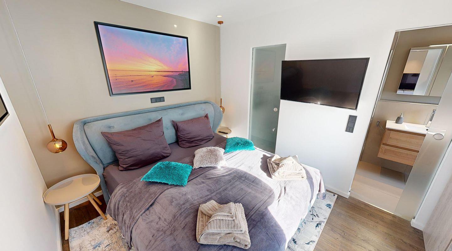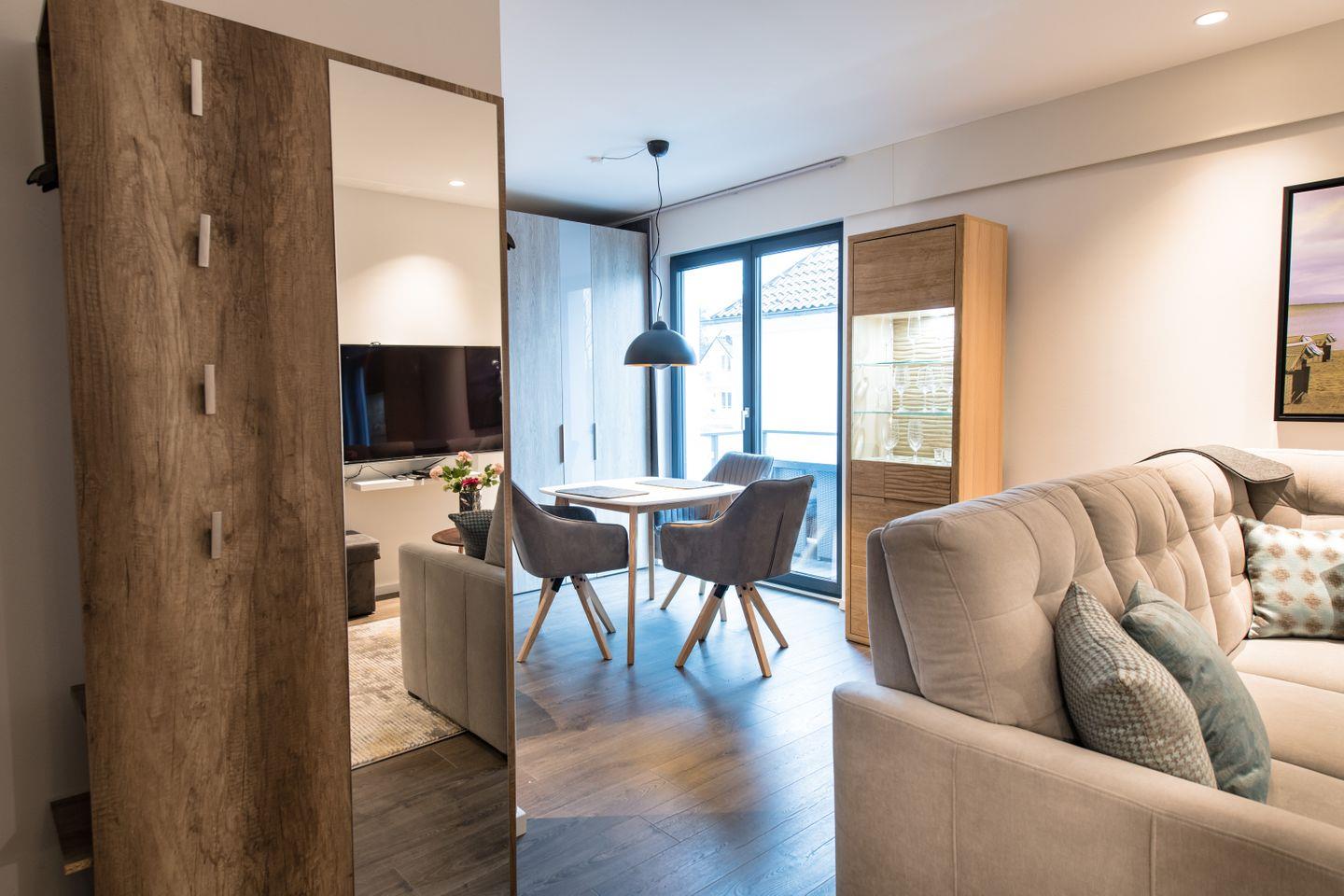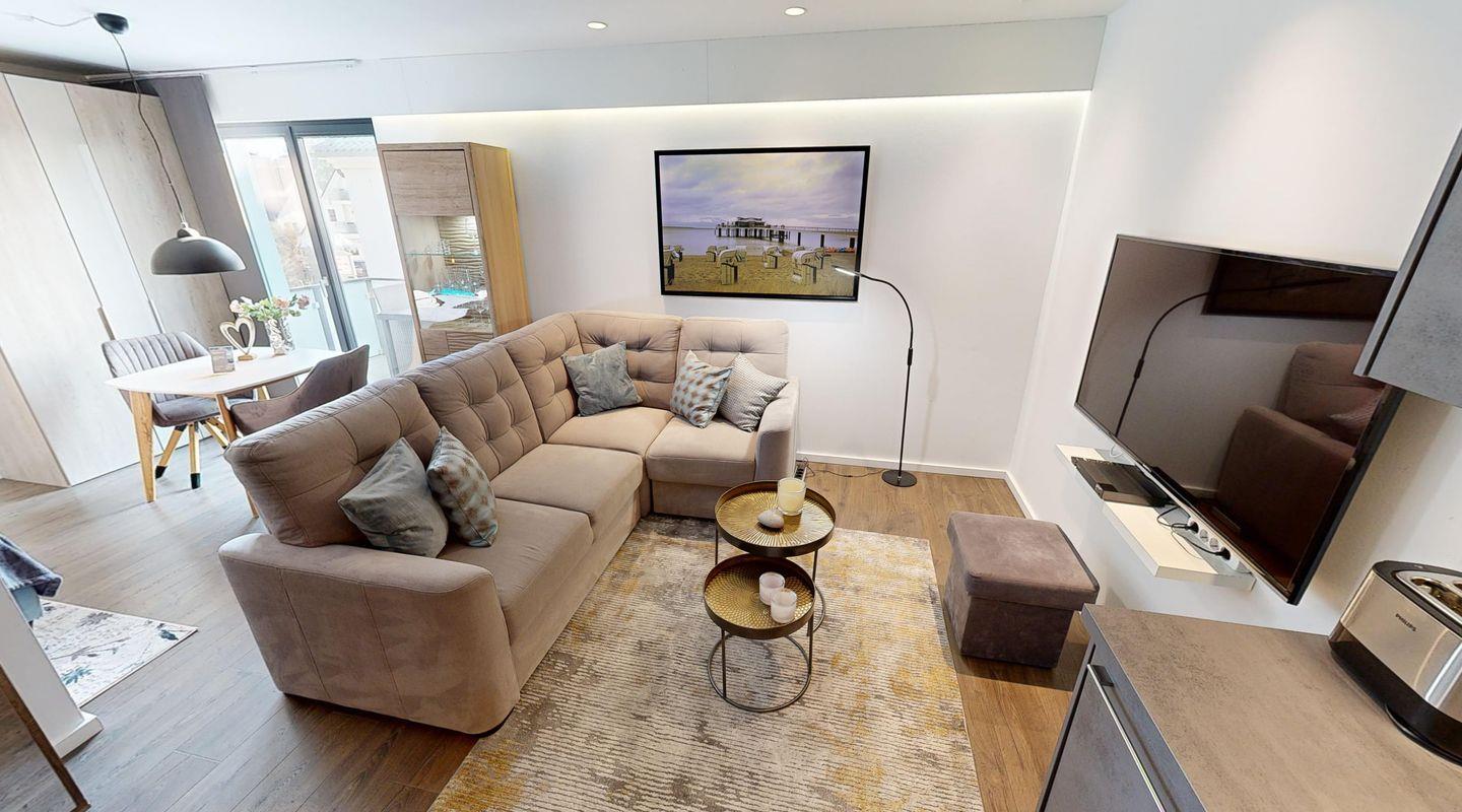 Auch die Ferienwohnung „Glück“ überzeugt auf kleinem Raum durch das konsequente Baltic Houses Design wie das helle Interieur und den modernen, offenen Grundriss. Die Wohnung ist perfekt für einen romantischen Pärchenurlaub geeignet, lässt sich aber auch durch einen architektonischen Kniff mit der Wohnung „Traum“ kombinieren. So entsteht Raum für eine tolle gemeinsame Zeit mit bis zu sechs Personen.