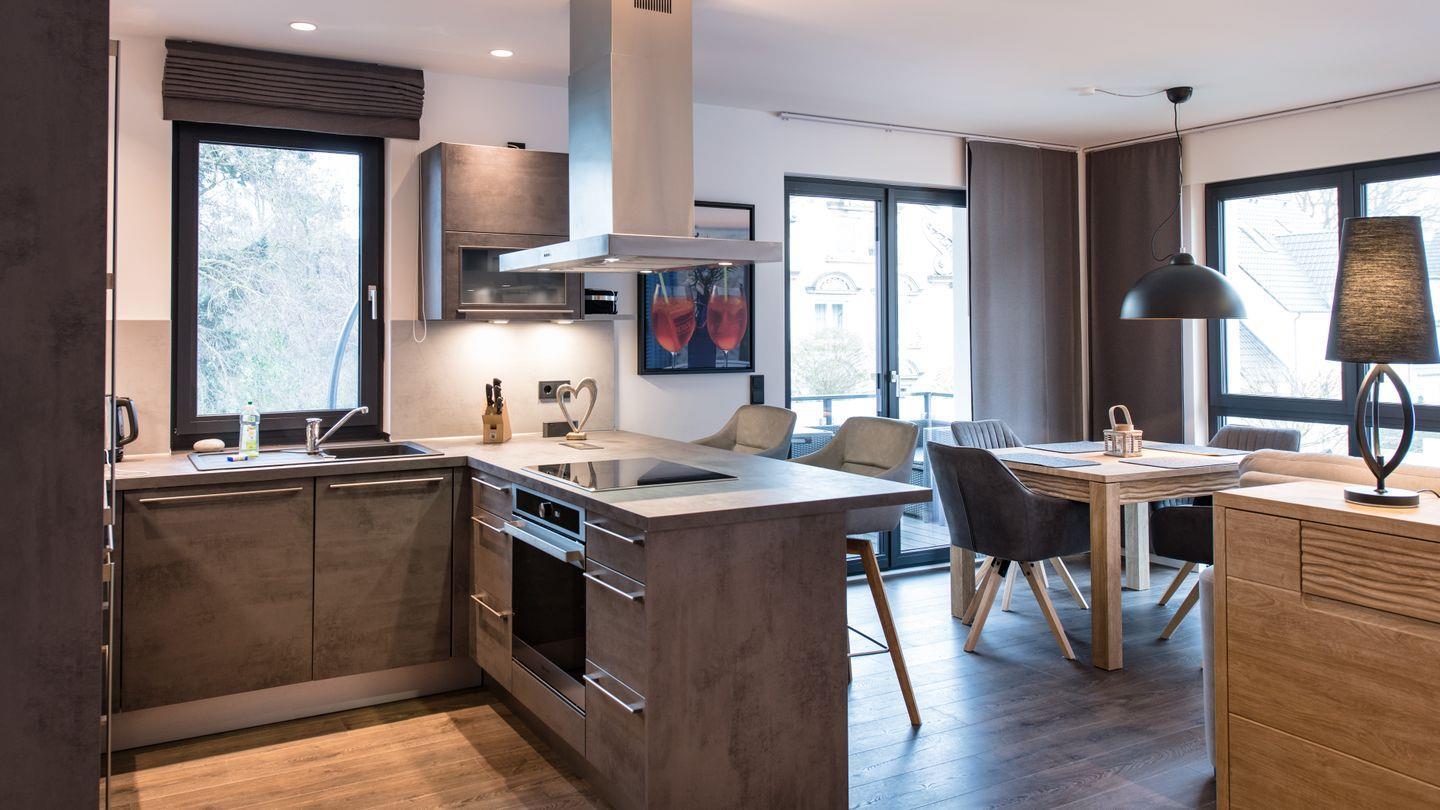 Im ersten Obergeschoss befindet sich die Ferienwohnung „Herz“. Sie ist 65 qm groß, für bis zu vier Personen konzipiert und zeichnet sich durch ihre helle skandinavisch angehauchte Gestaltung, den Echtholz-Parkettboden mit integrierter Fußbodenheizung und ihre ebenso gemütliche wie stilvolle Einrichtung aus. Mittelpunkt der Wohnungen ist eine offene Architektur, die Küche, Wohn- und Essbereich miteinander verbindet. Das Highlight ist eine Infrarotkabine für das perfekte Finish eines grandiosen Tages.