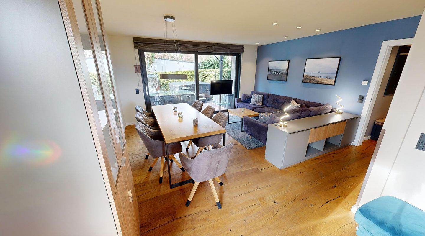 Die Ferienwohnung „Meeresbrise“ bietet Ihnen auf 105 qm ein entspanntes Zusammensein mit der ganzen Familie. Verteilen Sie sich auf drei Schlafzimmer und kommen Sie im gemütlichen Wohn- und Essbereich zusammen. Gönnen Sie sich nach einem aktiven Tag mit der Rasselbande vollkommende Entspannung in der eigenen Infrarotkabine. Die gesamte Wohnung ist hell und freundlich gestalltet, sodass Sie sich einfach nur wohlfühlen können