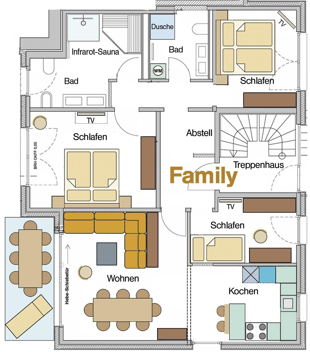 Verbringen Sie Ihre schönsten Tage im Jahr in reinster Wohlfühl Atmosphäre auf über 100 Quadratmeter. Die Ferienwohnung „Family“ ist das perfekte Urlaubs-Quartier für große Familien. Das Herzstück dieser Wohnung ist das liebevoll und mit vielen schönen Details eingerichtete Wohnzimmer – Es lädt regelrecht zu gemütlichen Spieleabenden mit der Familie ein. Die Krönung nach einem abenteuerlichen Tag mit den Kindern, ist die eigene Infrarotkabine in einem der zwei Duschbädern.