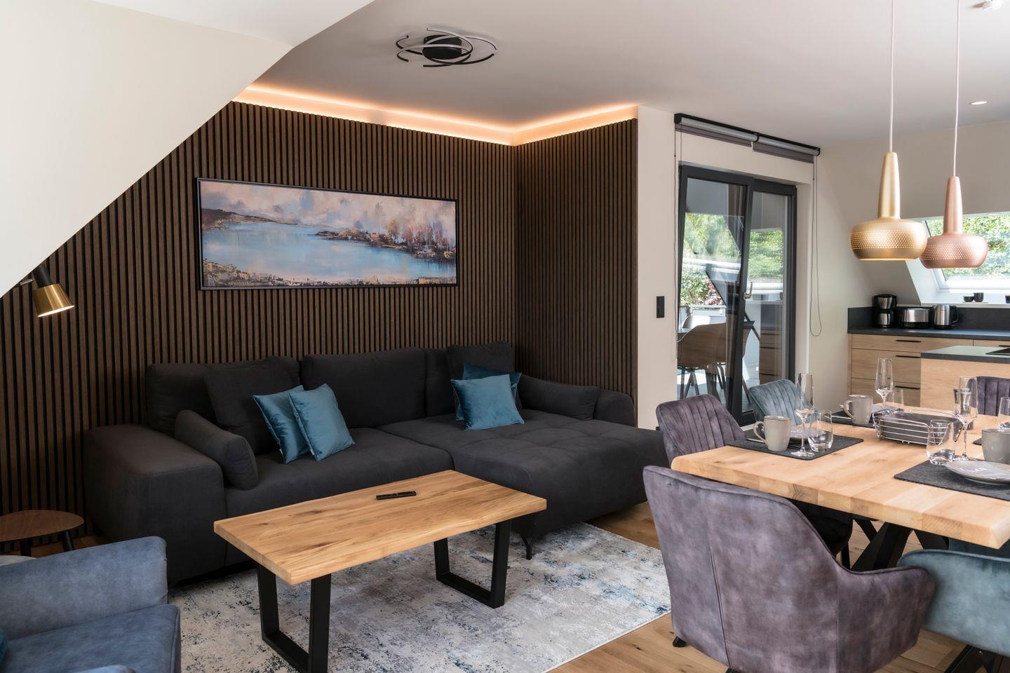Die 75 qm große Wohnung lädt dazu ein Ihr neues Wohlfühl Refugium zu werden. Das erstklassige Interieur und die umfrangreiche Ausstattung zaubern ein luxuriöses Ambiente das keine Wünsche offen lässt. Der Balkon mit hochwertigen Balkonmöbeln lädt zu einem entspannten Abend bei Sonnenuntergang ein und die Sauna vollendet das Wohlfühlpaket. Die Wohnung verfügt über ein Eltern und ein Kinder Schlafzimmer und ist daher für die ganze Familie geeignet. Weitere Schlafmöglichkeiten bietet das ausziehbare Sofa im Wohnzimmer.