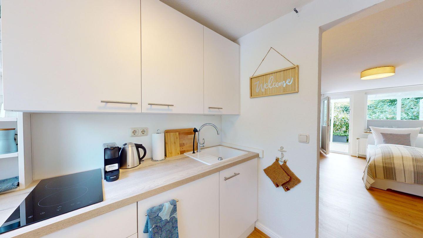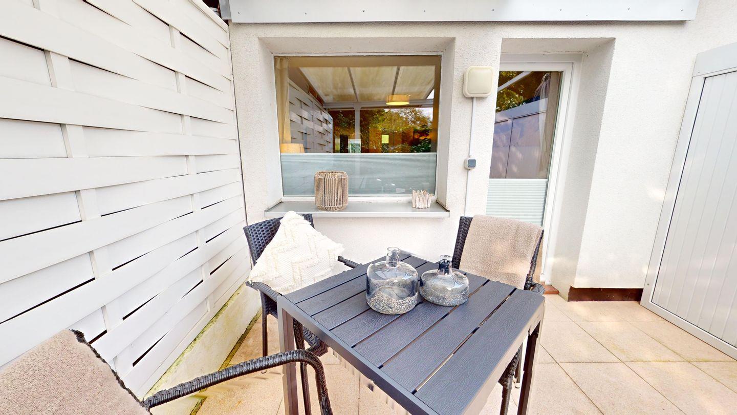 Die Wohnung hat eine gut ausgestattete Küchenzeile sowie eine kleinen gemütlichen Essbereich. Die Wohnung verfügt über zwei Terrassen, die Ihnen verschiedene Möglichkeiten bieten, die frische Ostseeluft zu genießen. Die Terrasse in Südwestlage hinter dem Haus ist ein idealer Ort, um in Ruhe zu entspannen. Hier finden einen Esstisch mit Stühlen, perfekt für Mahlzeiten im Freien oder einfach, um die Sonne zu genießen. Auf der Terrasse vor dem Haus können Sie den morgendlichen Kaffee genießen und die Stille der ruhigen Sackgasse in vollen Zügen auskosten.