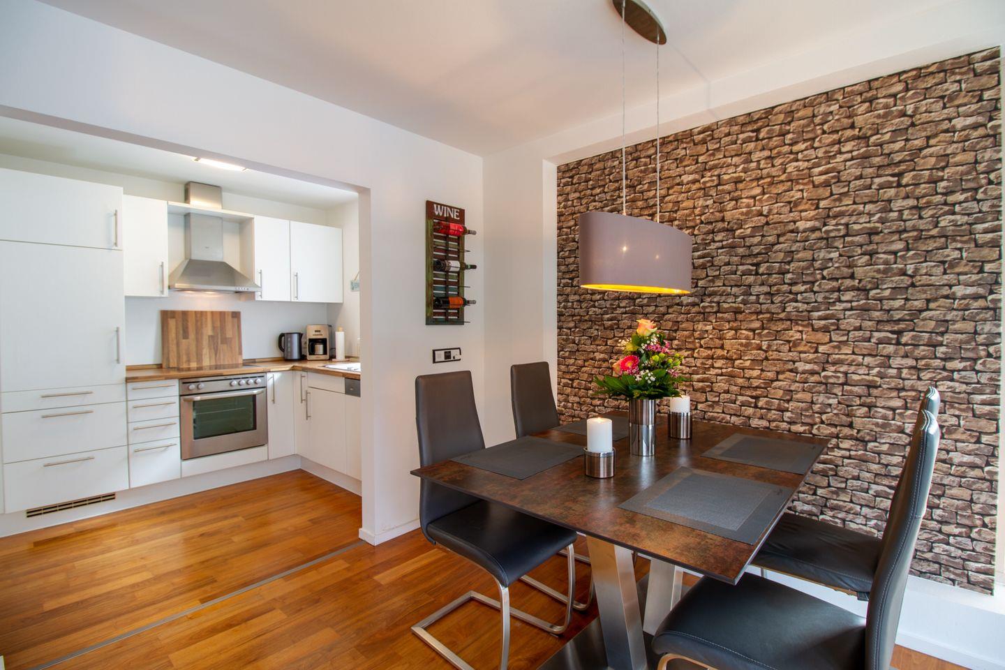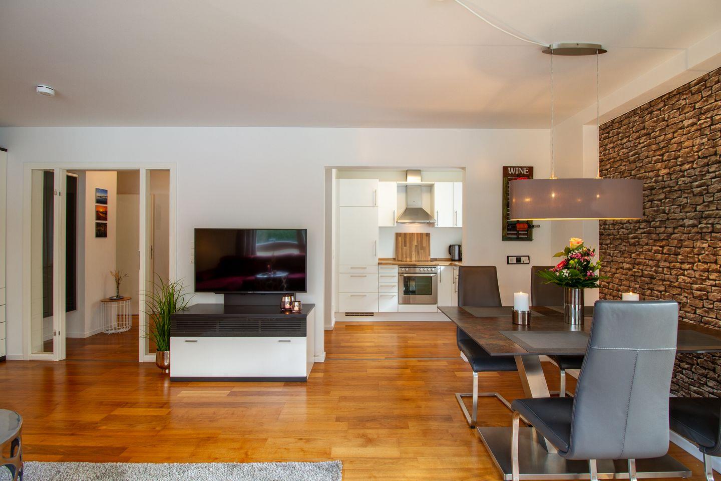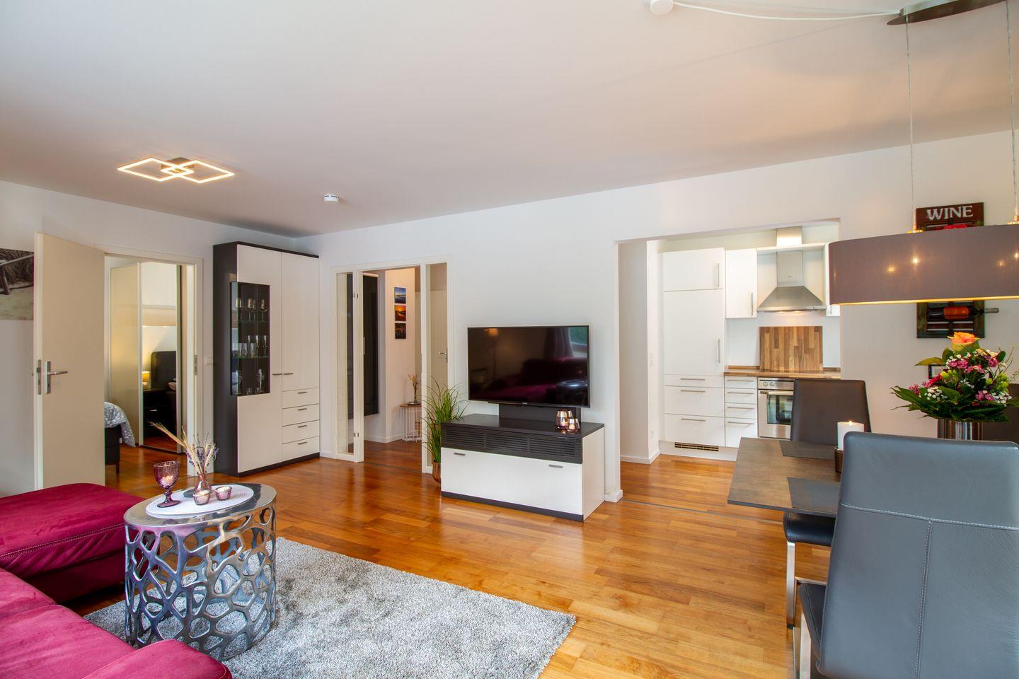 Die Wohnung bietet einen kombinierten Wohn-/Essbereich mit einem hochwertigen Schlafsofa und einer offenen Einbauküche. Der großzügige Süd-/Westbalkon ist mit hochwertigen Sitzmöbeln ausgestattet und lädt zum Frühstücken unter freiem Himmel oder einem Sundowner ein. Das Schlafzimmer verfügt über ein Boxspringbett, einen großen Kleiderschrank und einen Fernseher. Das luxuriöse Bad ist mit einer großzügig angelegten Walk-in Dusche ausgestattet. Die Wohnung eignet sich ideal für 2-3 Personen, da es nur ein separates Schlafzimmer gibt. Die Waschmaschine im Keller steht exklusiv unseren Gästen zur Verfügung.