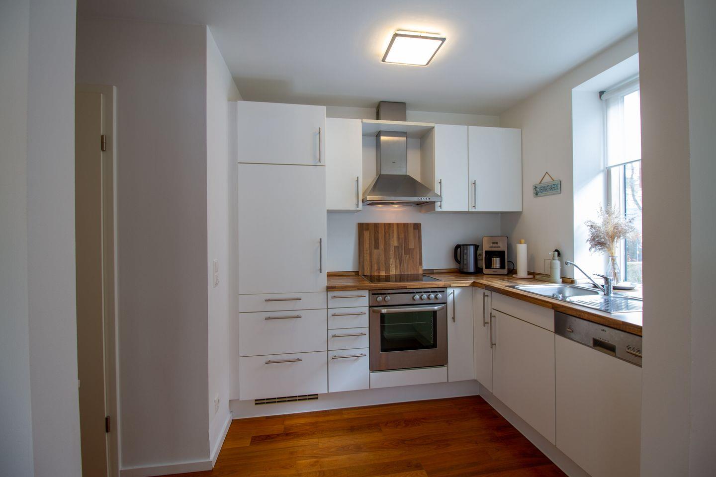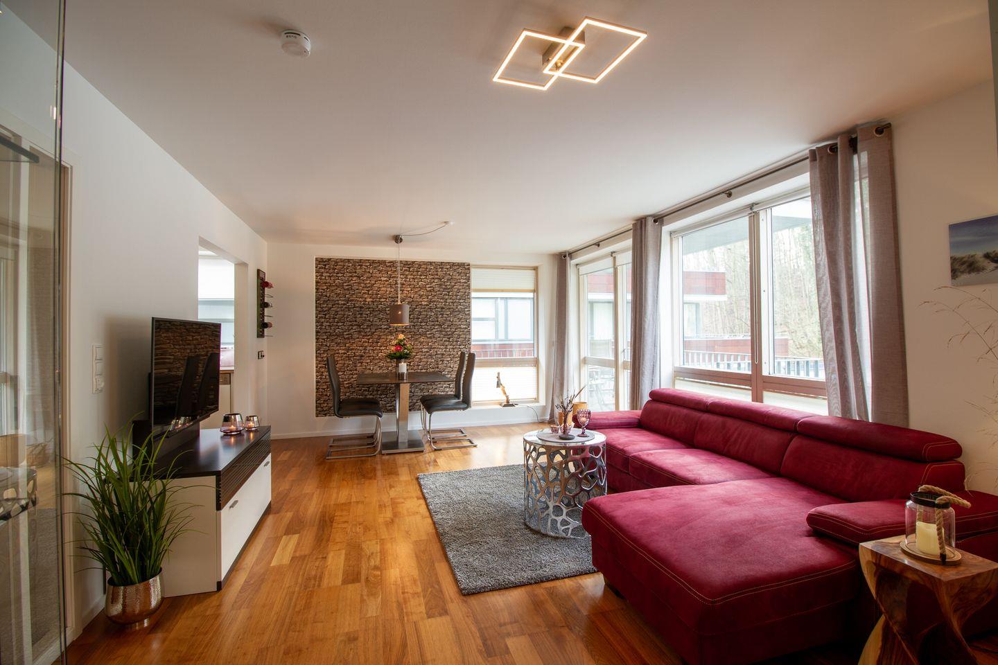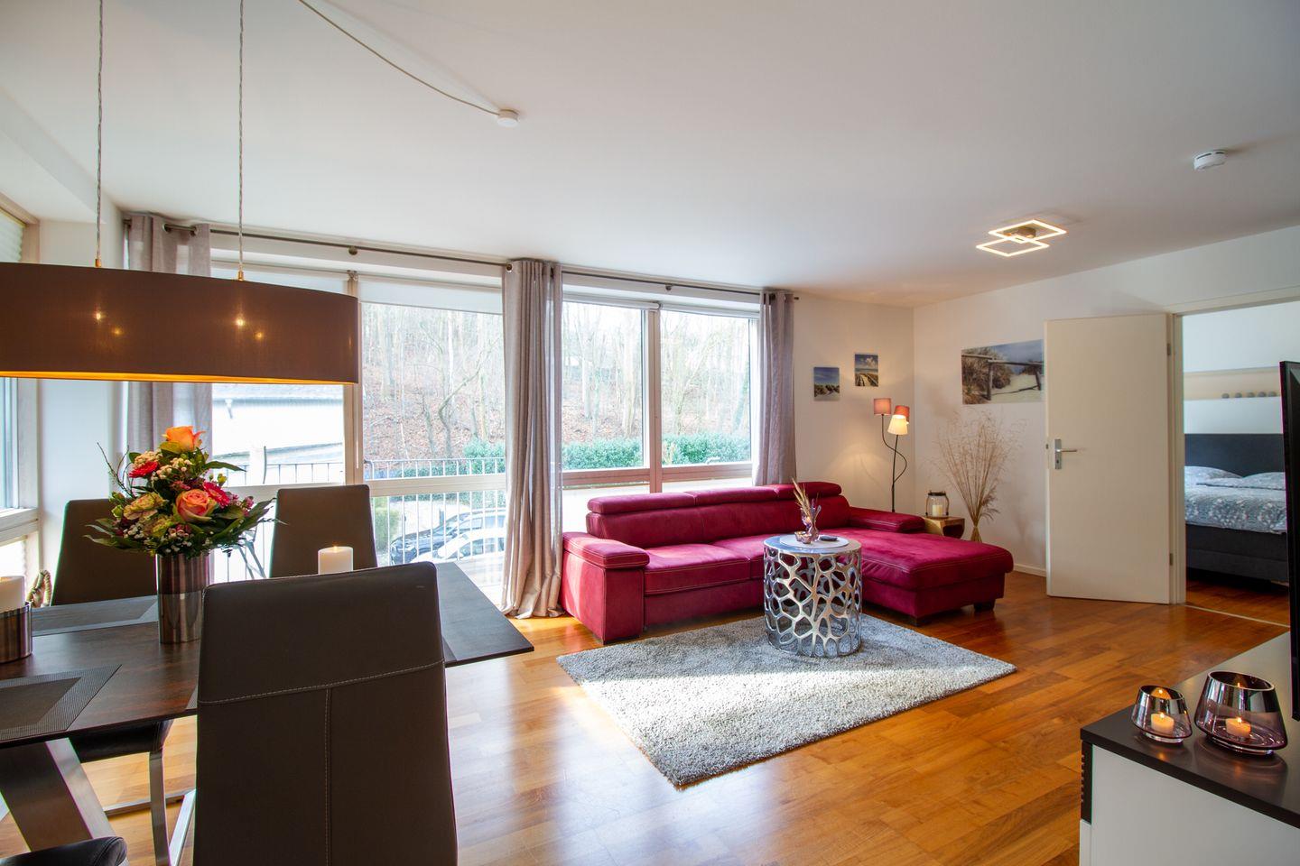 Die Wohnung bietet einen kombinierten Wohn-/Essbereich mit einem hochwertigen Schlafsofa und einer offenen Einbauküche. Der großzügige Süd-/Westbalkon ist mit hochwertigen Sitzmöbeln ausgestattet und lädt zum Frühstücken unter freiem Himmel oder einem Sundowner ein. Das Schlafzimmer verfügt über ein Boxspringbett, einen großen Kleiderschrank und einen Fernseher. Das luxuriöse Bad ist mit einer großzügig angelegten Walk-in Dusche ausgestattet. Die Wohnung eignet sich ideal für 2-3 Personen, da es nur ein separates Schlafzimmer gibt. Die Waschmaschine im Keller steht exklusiv unseren Gästen zur Verfügung.