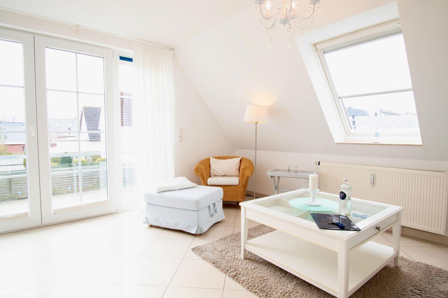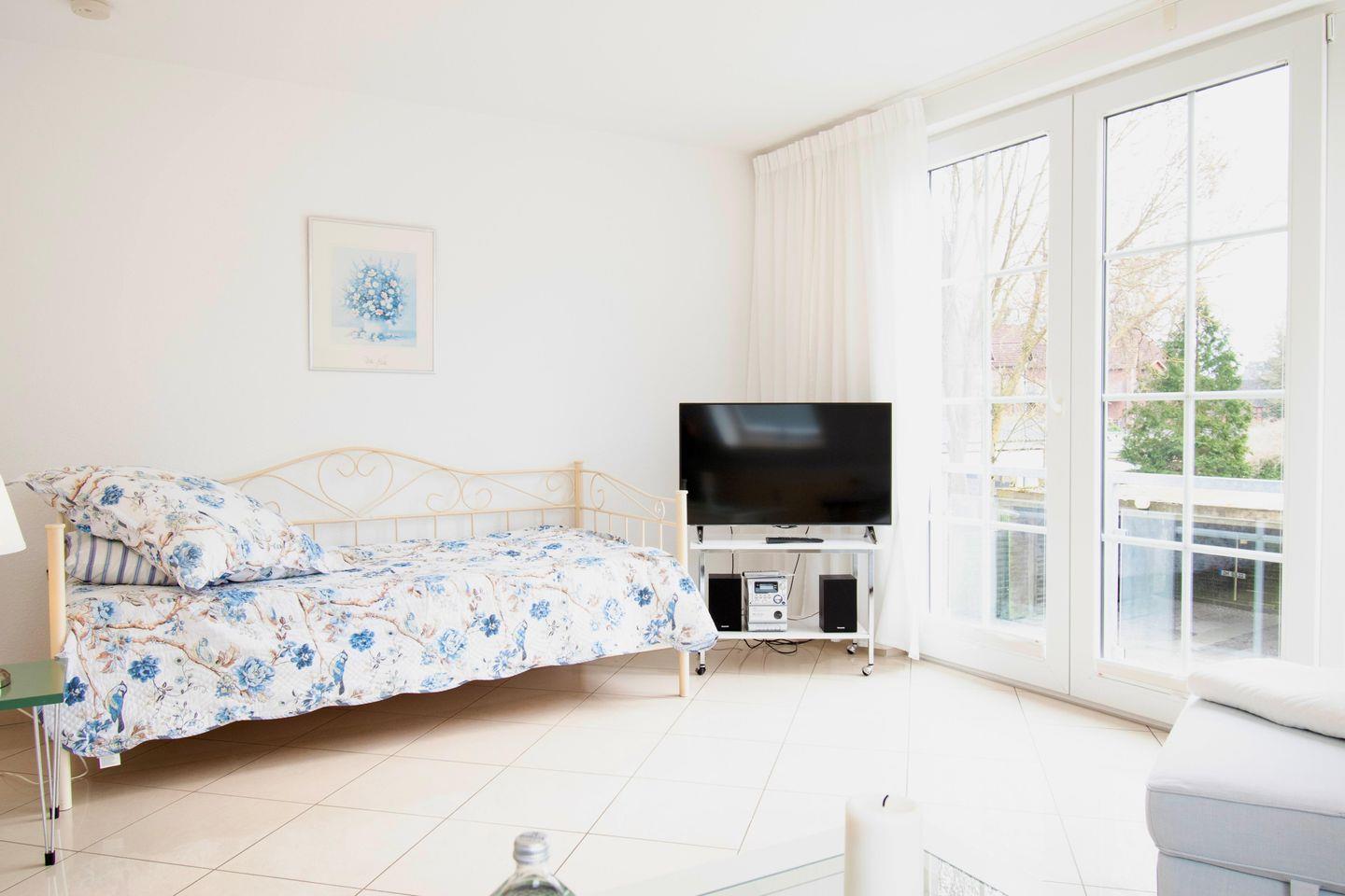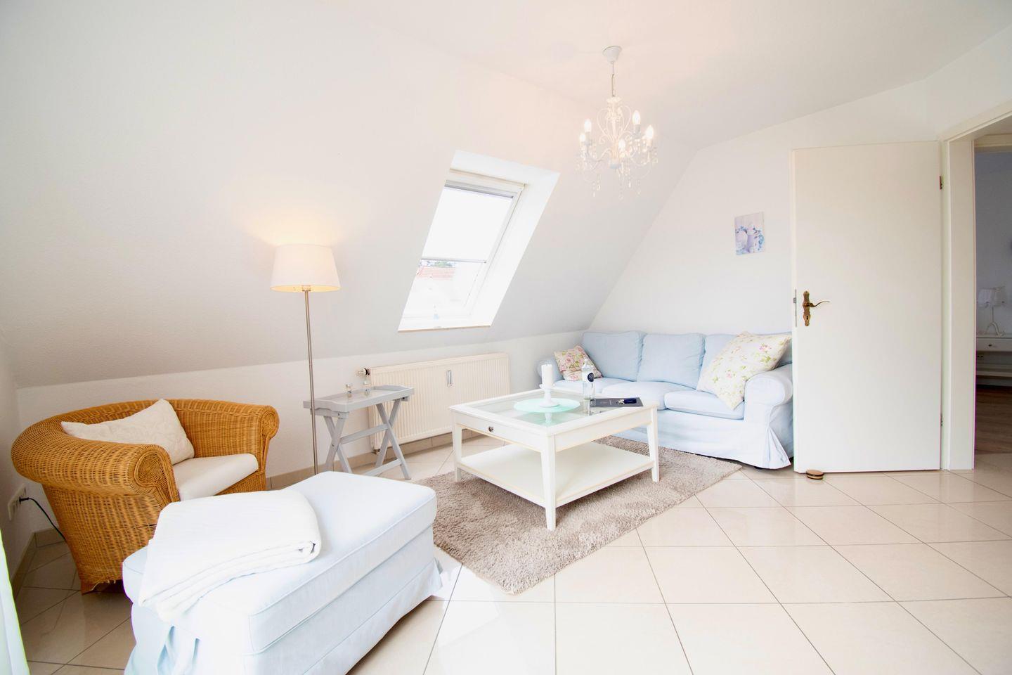 Entspannen Sie im gemütlichen, lichtdurchfluteten Wohnzimmer, das zusätzlich über ein weiteres Einzelbett verfügt, Hier können Sie sich entspannen, ein gutes Buch lesen oder gemeinsame Fernsehabende nach einen Strandtag verleben.