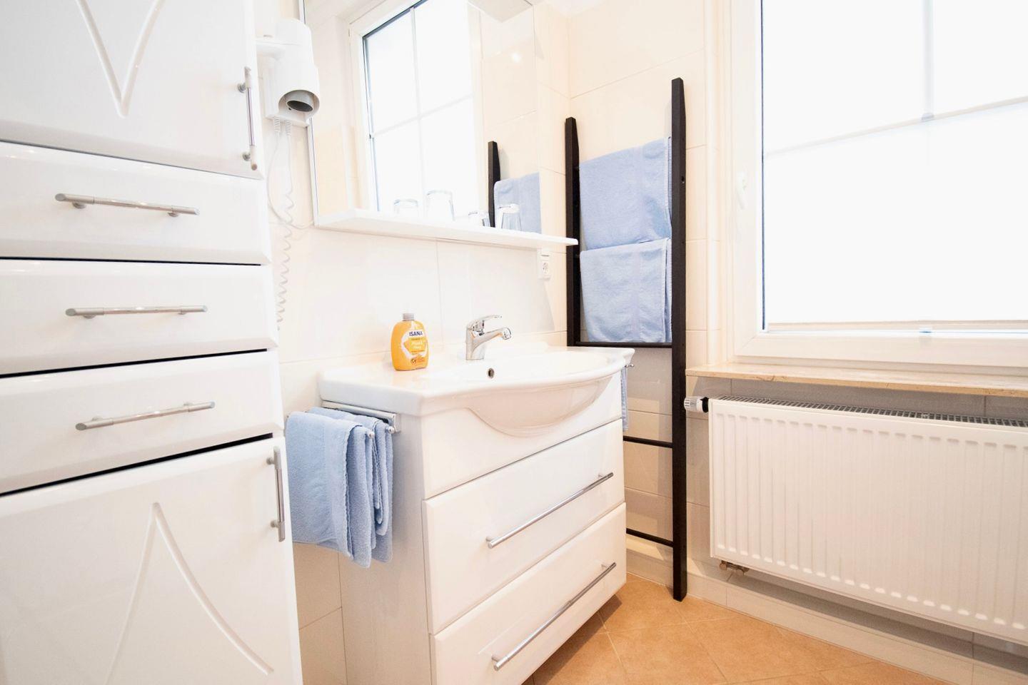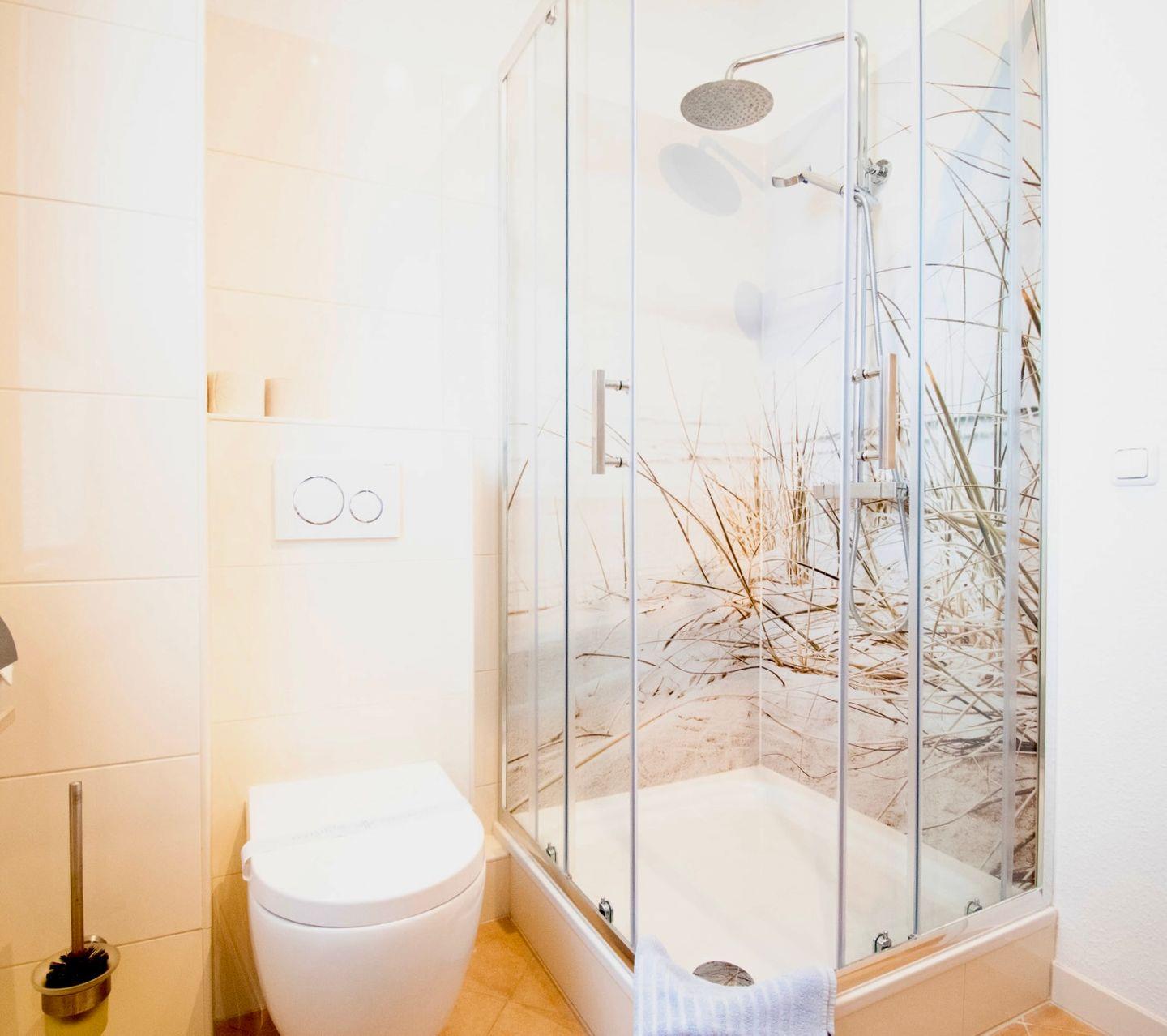Das Badezimmer ist mit einer Dusche ausgestattet und bietet Ihnen alles, was Sie für Ihre tägliche Pflege benötigen. Frische Handtücher stehen für Sie bereit, damit Sie sich nach einem Tag am Strand erfrischen können.