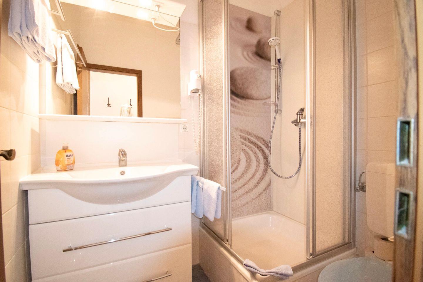 Das Apartment verfügt über ein separates Duschbad, das mit allem ausgestattet ist, was Sie für Ihre tägliche Pflege benötigen. Frische Handtücher liegen für Sie bereit, damit Sie sich nach einem Tag am Strand erfrischen können.