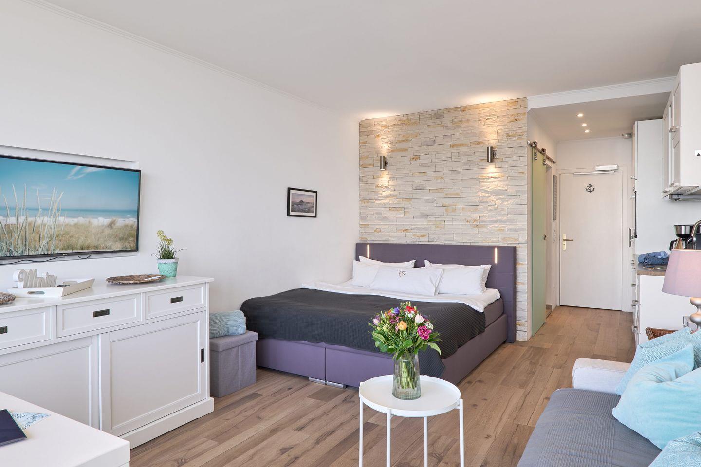 Willkommen in unserer wunderschönen Ferienwohnung im Herzen von Timmendorfer Strand nur wenige Schritte vom Meer entfernt. Die Wohnung befindet sich in der 6. Etage im Plaza Hotel Timmendorfer Strand und bietet auf 35 m² ein modernes, komfortables Ambiente mit traumhaftem Meerblick. Der offene Wohn- und Schlafbereich ist stilvoll eingerichtet und verfügt über ein gemütliches Doppelbett sowie eine Schlafcouch, die Platz für bis zu drei Personen bietet. Das helle, moderne Duschbad rundet den hohen Komfort der Wohnung ab. Durch die zentrale Lage sind sowohl der Strand als auch zahlreiche Restaurants, Cafés und Geschäfte bequem zu Fuß erreichbar. Genießen Sie die frische Meeresbrise und entspannen Sie in einer Umgebung, die alles für einen perfekten Ostseeurlaub bietet. Hier erleben Sie erholsame Tage in einem gemütlichen Zuhause auf Zeit, in dem Ihnen der Alltag fern und das Meer ganz nah ist.