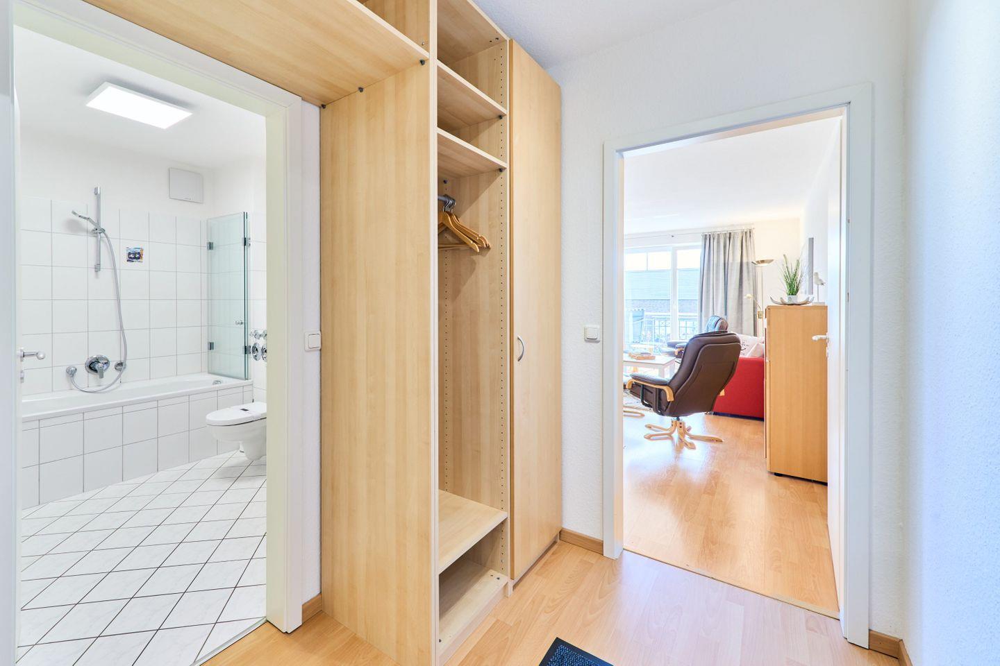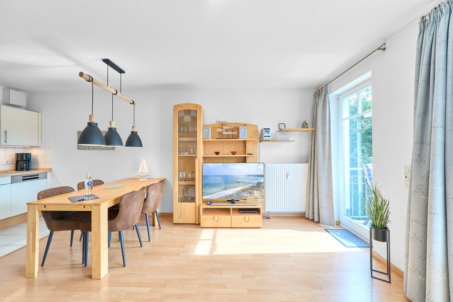 Die 60 m² große Ferienwohnung Ap. B 12 liegt in der 1. Etage und ist ideal für bis zu 2 Personen. Sie bietet einen großzügigen Wohnbereich mit einer bequemen Sitzgruppe, einem Farb-TV mit DVD-Player und einer Stereoanlage. Die voll ausgestattete Einbauküche verfügt über einen Geschirrspüler, Mikrowelle und eine gemütliche Sitzecke. Vom Wohnbereich aus gelangen Sie auf den südlich ausgerichteten Balkon, auf dem Sie entspannte Stunden genießen können.