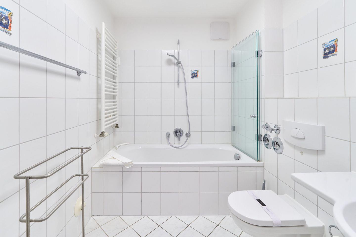Das Schlafzimmer ist mit einem komfortablen Boxspringbett (2 x 90cm x 200 cm) ausgestattet, während das hell geflieste Badezimmer mit Badewanne, WC, Fön und einem Handtuchwärmer für Wohlfühlatmosphäre sorgt.