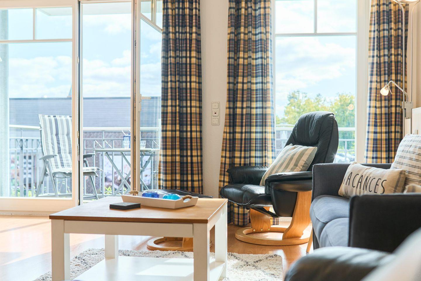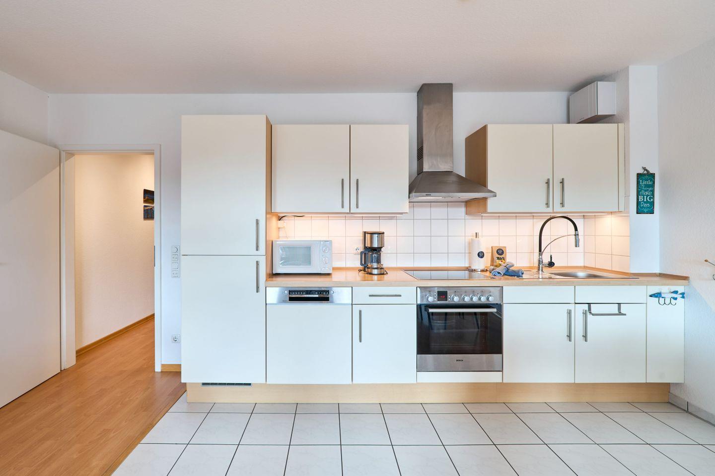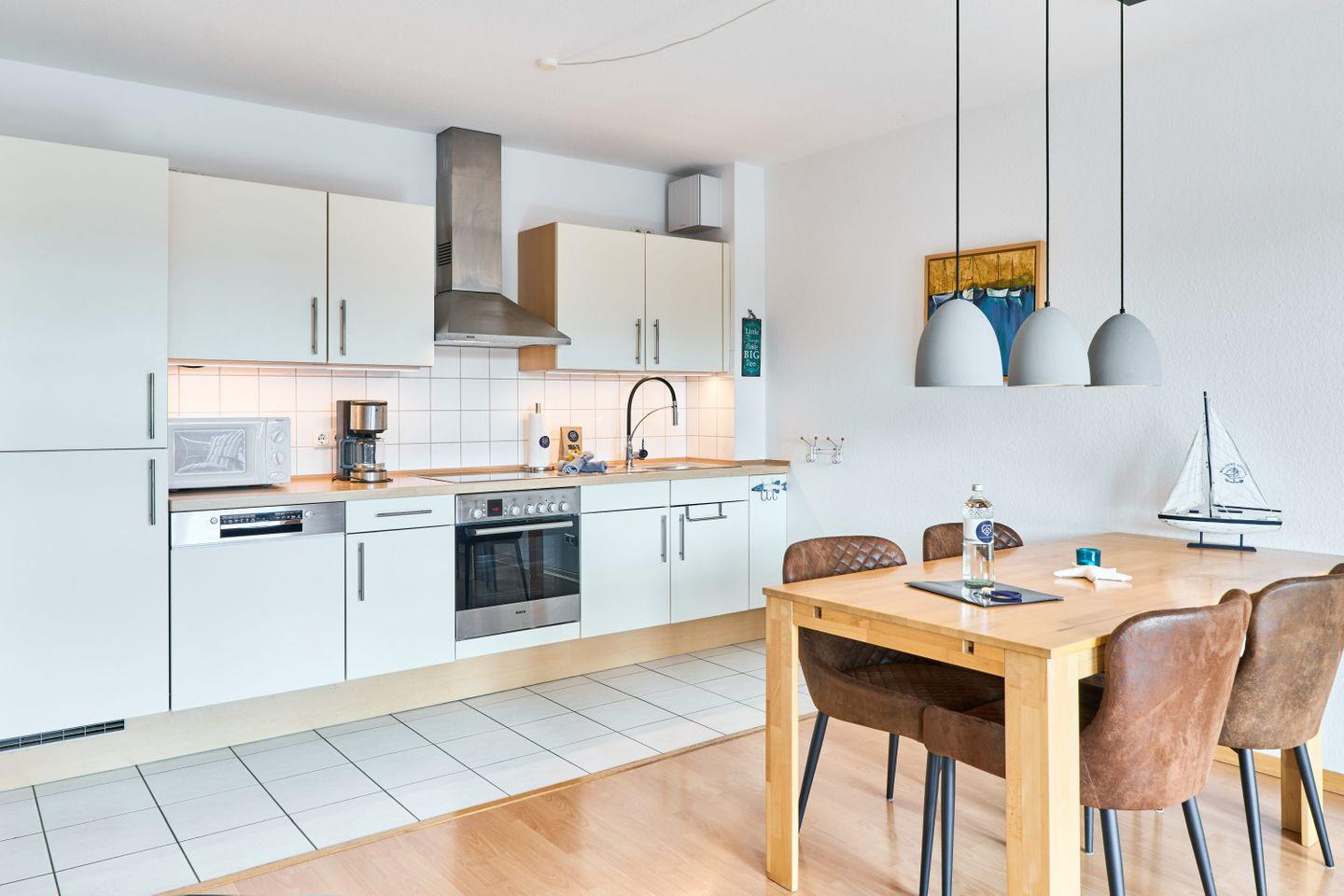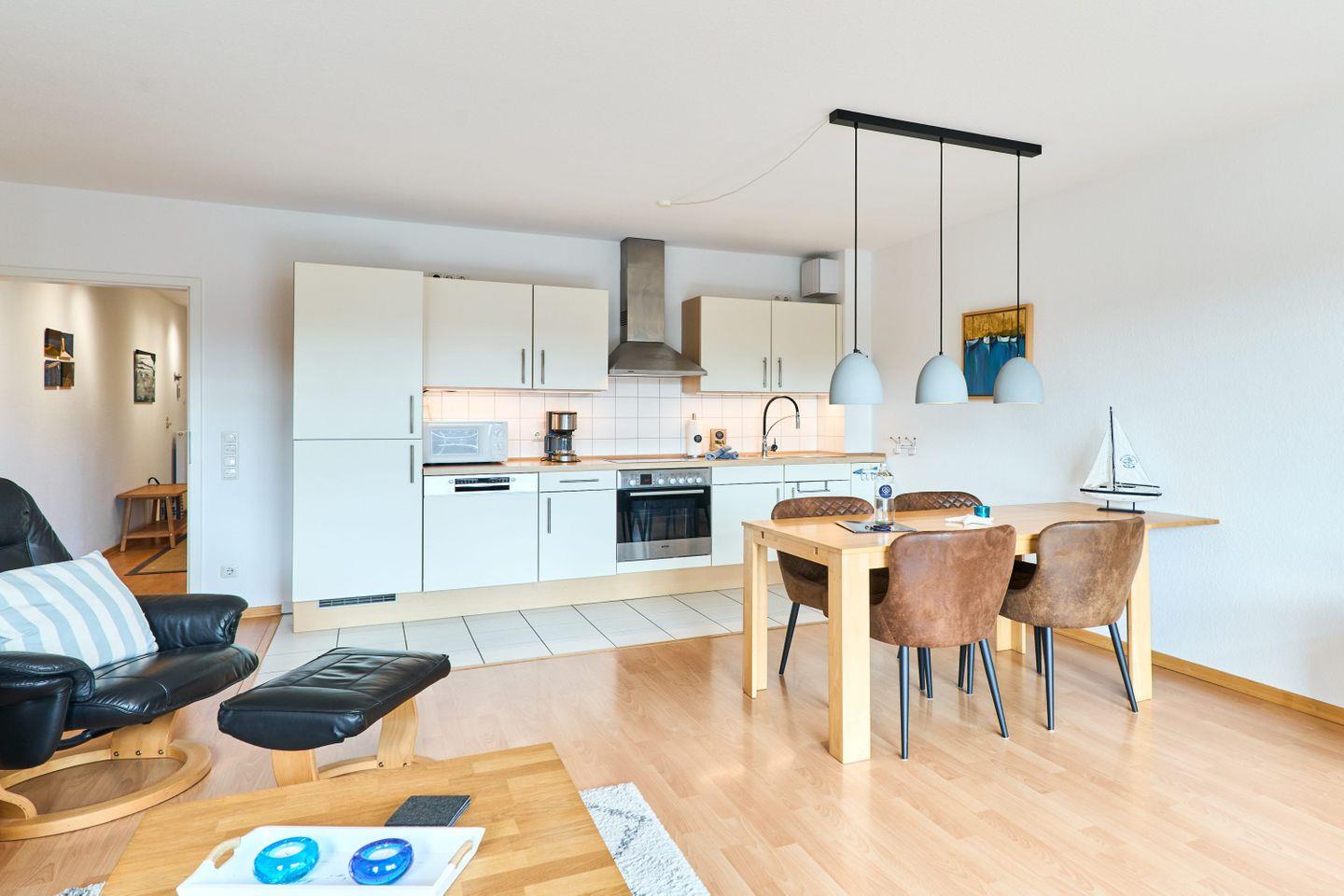 Die 60 m² große Ferienwohnung Ap. B 13 liegt in der 1. Etage und ist ideal für bis zu 2 Personen. Sie bietet einen großzügigen Wohnbereich mit einer bequemen Sitzgruppe, einem Farb-TV und einer Stereoanlage. Die voll ausgestattete Einbauküche verfügt über einen Geschirrspüler, Mikrowelle und eine gemütliche Sitzecke. Vom Wohnbereich aus gelangen Sie auf den südlich ausgerichteten Balkon, auf dem Sie entspannte Stunden genießen können.