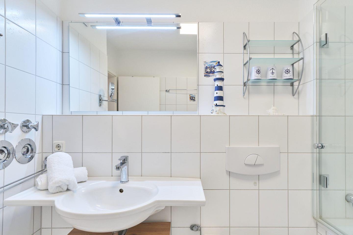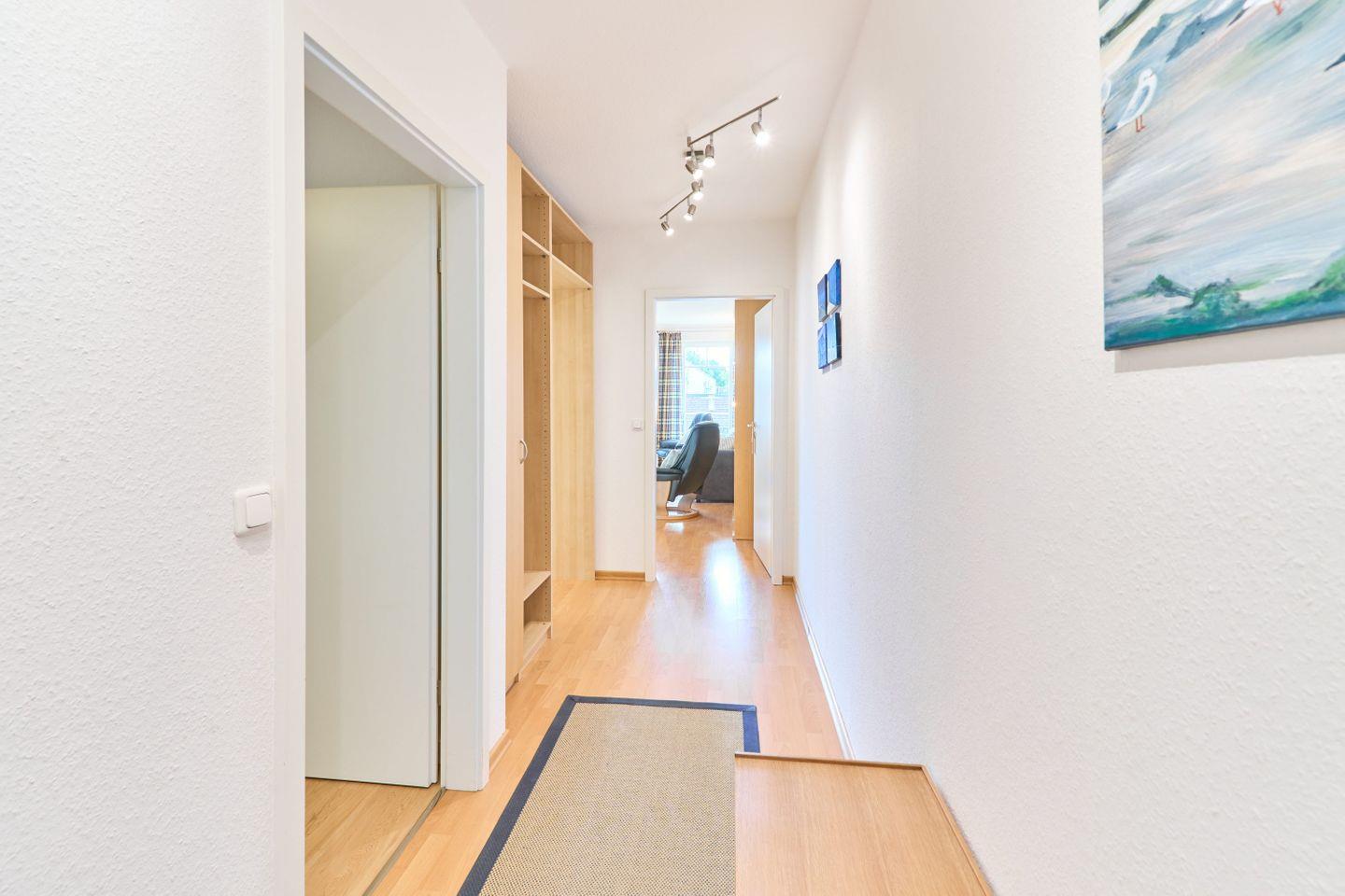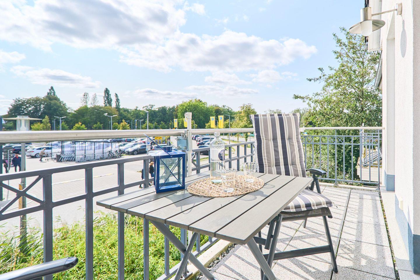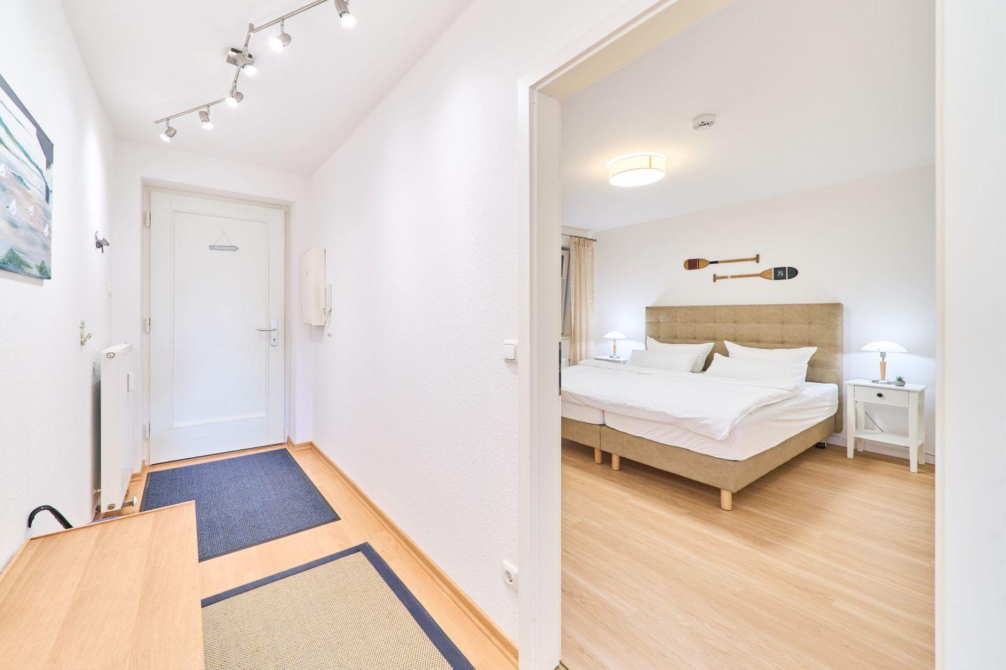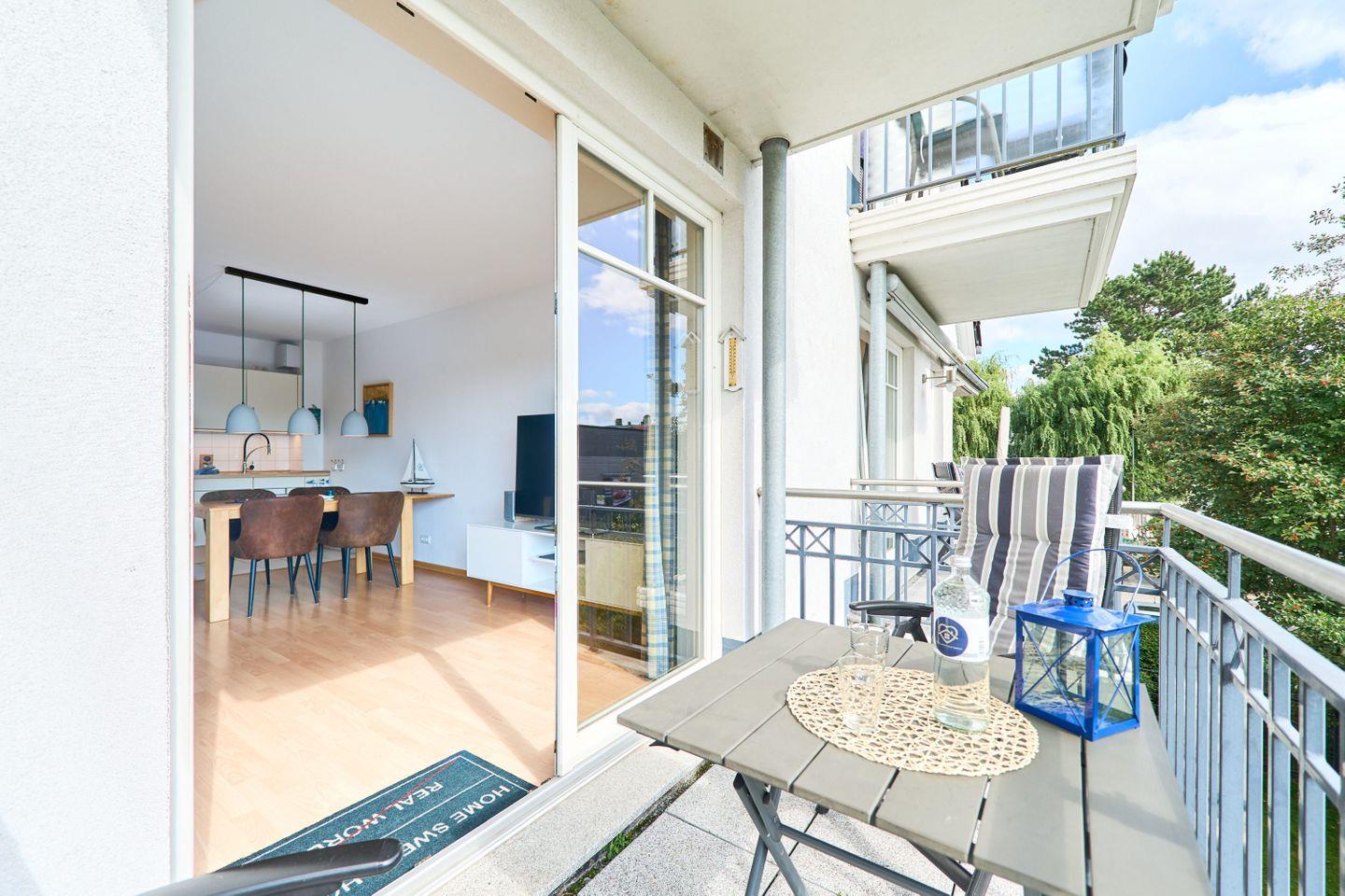Die 60 m² große Ferienwohnung Ap. B 13 liegt in der 1. Etage und ist ideal für bis zu 2 Personen. Sie bietet einen großzügigen Wohnbereich mit einer bequemen Sitzgruppe, einem Farb-TV und einer Stereoanlage. Die voll ausgestattete Einbauküche verfügt über einen Geschirrspüler, Mikrowelle und eine gemütliche Sitzecke. Vom Wohnbereich aus gelangen Sie auf den südlich ausgerichteten Balkon, auf dem Sie entspannte Stunden genießen können.