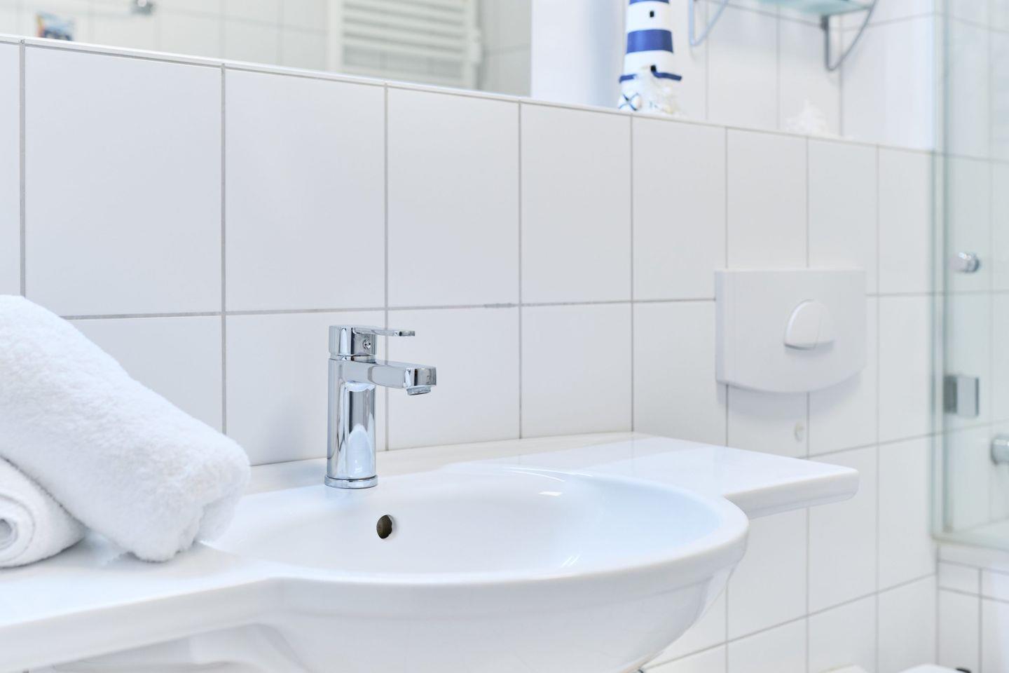Das Schlafzimmer ist mit einem komfortablen Boxspringbett (2x 90 cm x 200 cm) ausgestattet, während das hell geflieste Badezimmer mit Badewanne, WC, Fön und einem Handtuchwärmer für Wohlfühlatmosphäre sorgt.
