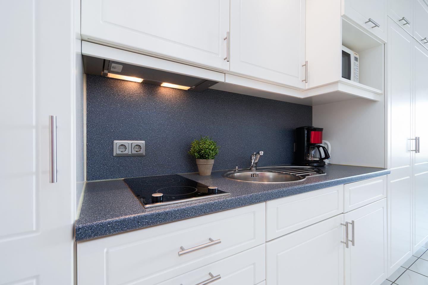 Die offene Küchenzeile ist mit Backofen, Herd und Mikrowelle ausgestattet und bietet alles, um ein leckeres Frühstück oder Abendessen zuzubereiten.