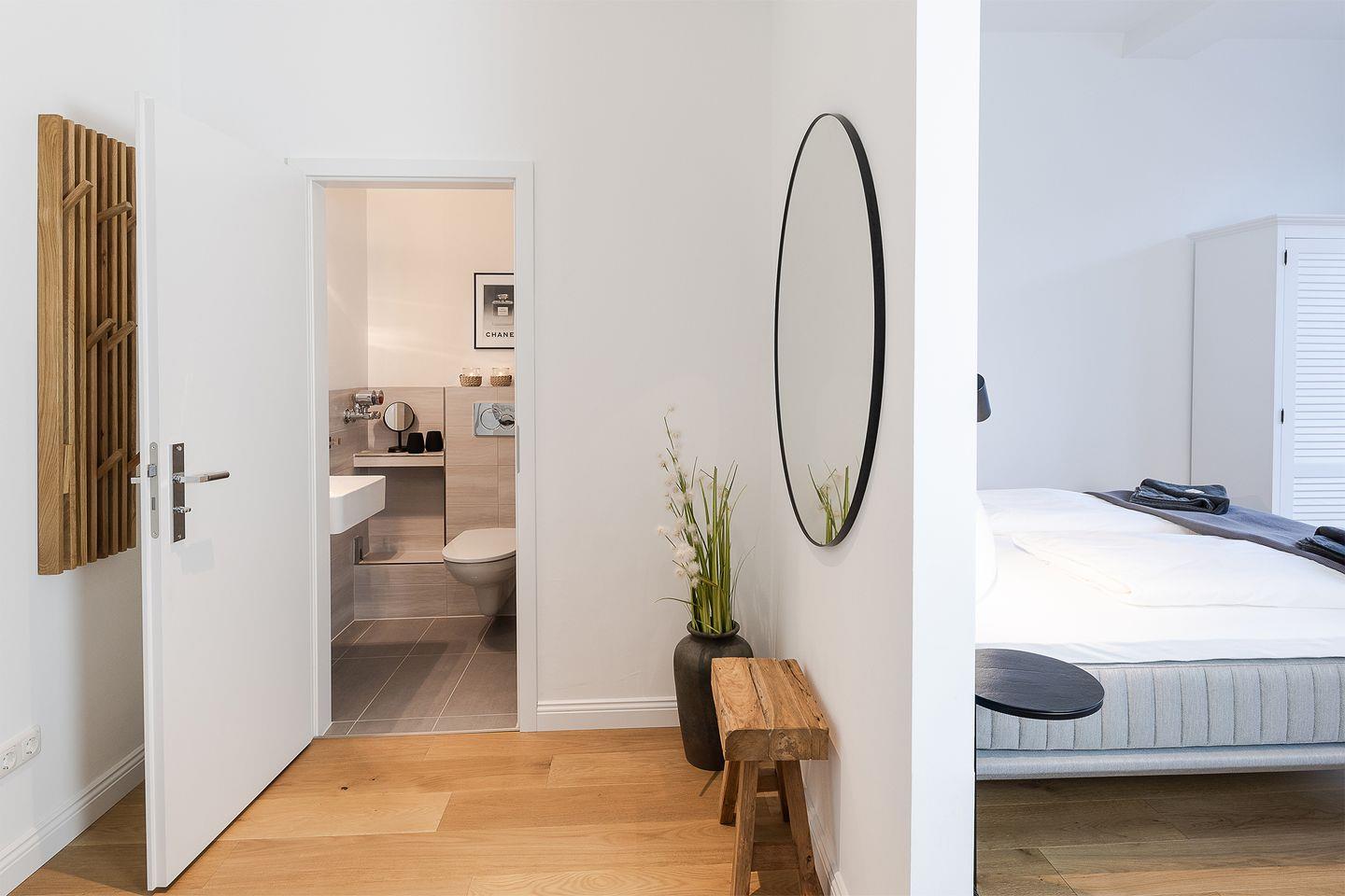 Die Ferienwohnung überzeugt mit einem hellen, offen gestalteten Wohn- und Schlafbereich. Ein komfortables Boxspringbett sorgt für erholsamen Schlaf, und aus dem Wohnzimmer erhaschen Sie sogar einen kleinen Blick auf die Ostsee – für die Extraportion Urlaubsgefühl.