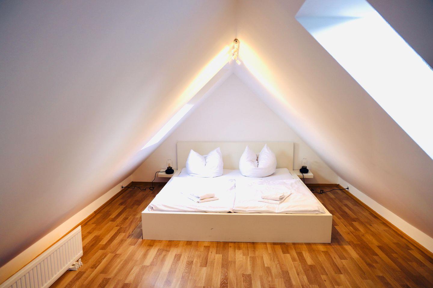 Das Schlafzimmer in Wohnung C befindet sich im ausgebauten Dachgeschoss des gemütlichen Apartments und ist über eine Stiege aus dem Wohnbereich zu erreichen. Vom Bett aus kannst du direkt den Sternenhimmel beobachten. Das Bett ist 160 x 200 cm groß.