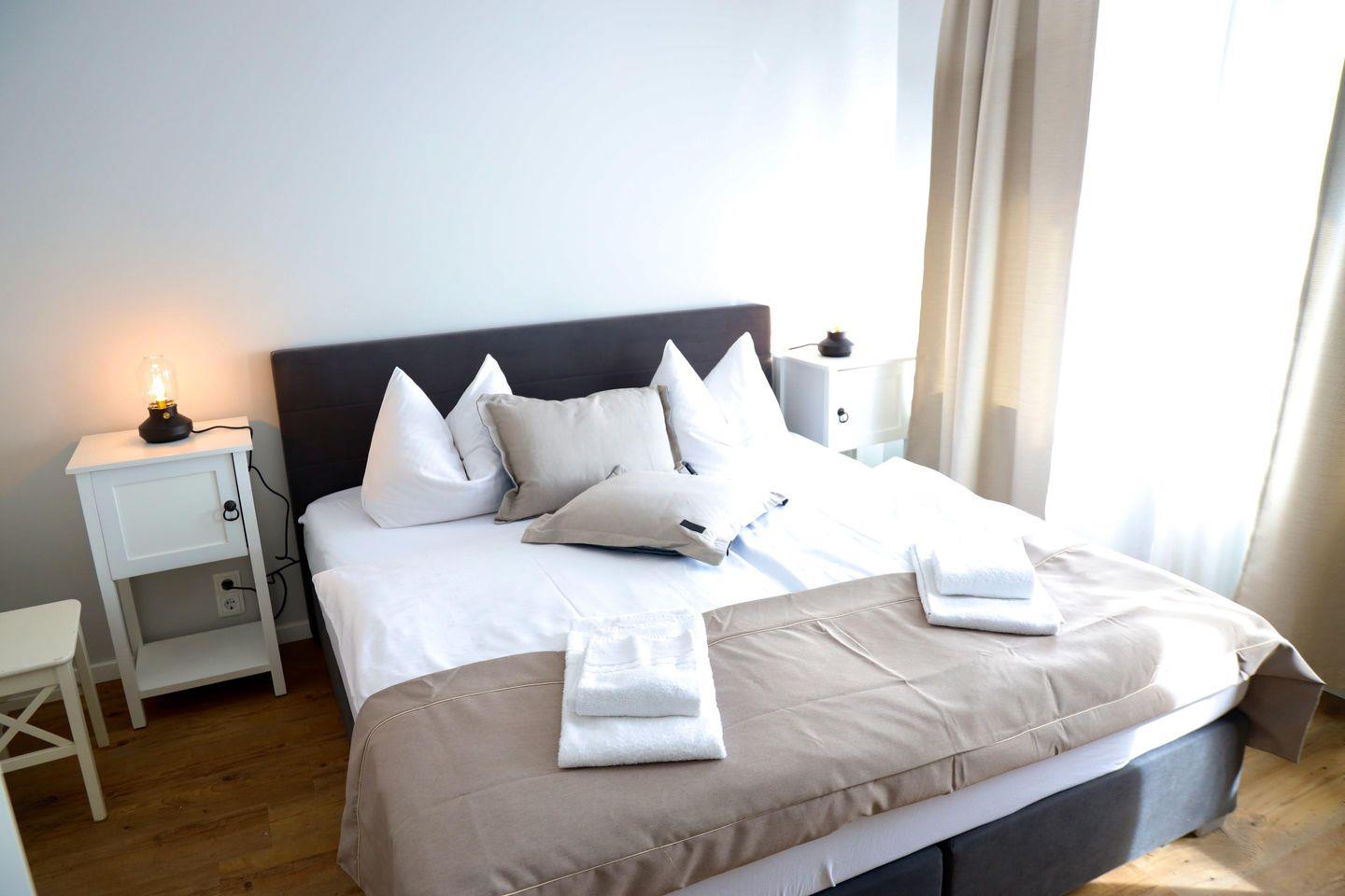 Das separate Schlafzimmer in Wohnung D ist mit einem Boxspringbett (160 x 200) ausgestattet. Ein offener Kleiderschrank und Kommode bieten ausreichen Stauraum.