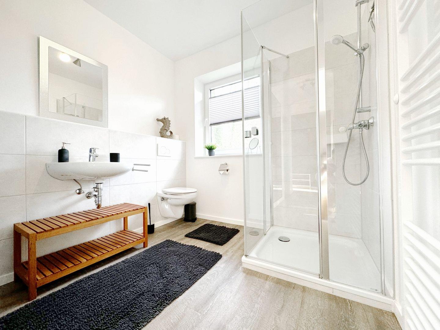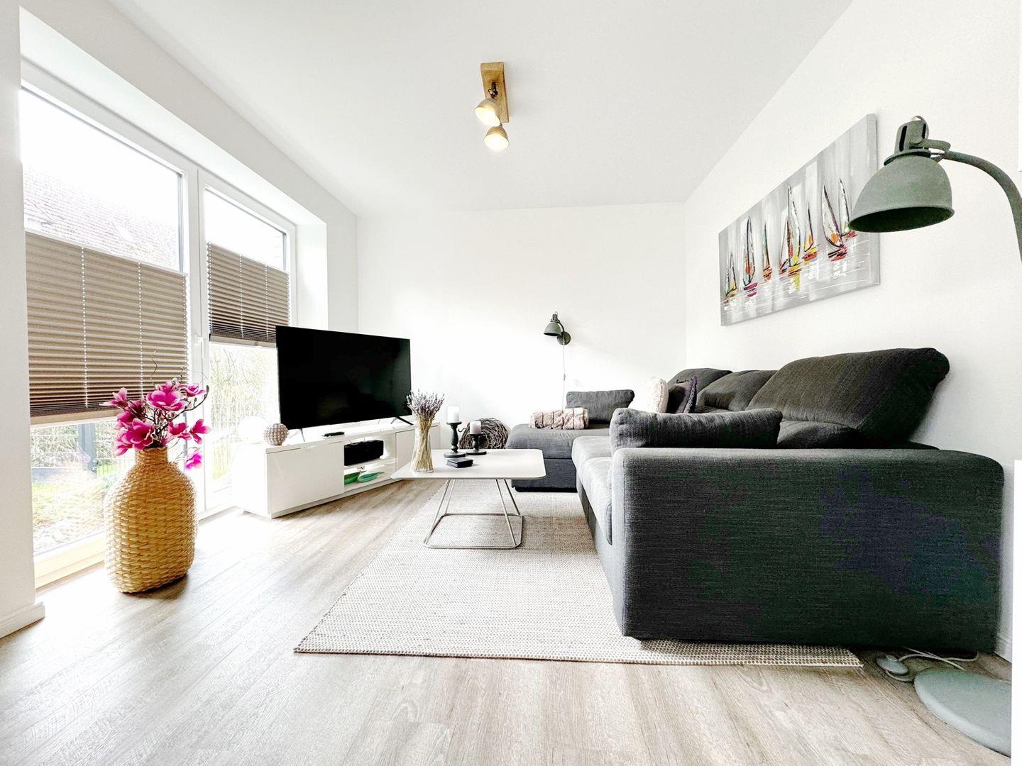 Das Raumkonzept der Ferienwohnung überzeugt durch eine offene, helle Gestaltung. Der großzügige Wohnbereich mit Sofaecke, Vinylboden und großem Smart-TV lädt zu gemütlichen Abenden ein. Ein Essbereich mit Tisch und passenden Stühlen grenzt direkt an die hochwertige offene Küche, die mit modernen Geräten wie Ceranherd, Backofen, Spülmaschine, Kühlschrank mit Gefrierfach, Wasserkocher, Nespresso-Espressomaschine, Kaffeemaschine und Toaster ausgestattet ist. Die vollständigen Küchenutensilien ermöglichen dir die unkomplizierte Selbstversorgung – ganz gleich, ob zum Frühstück oder für mehrgängige Menüs.