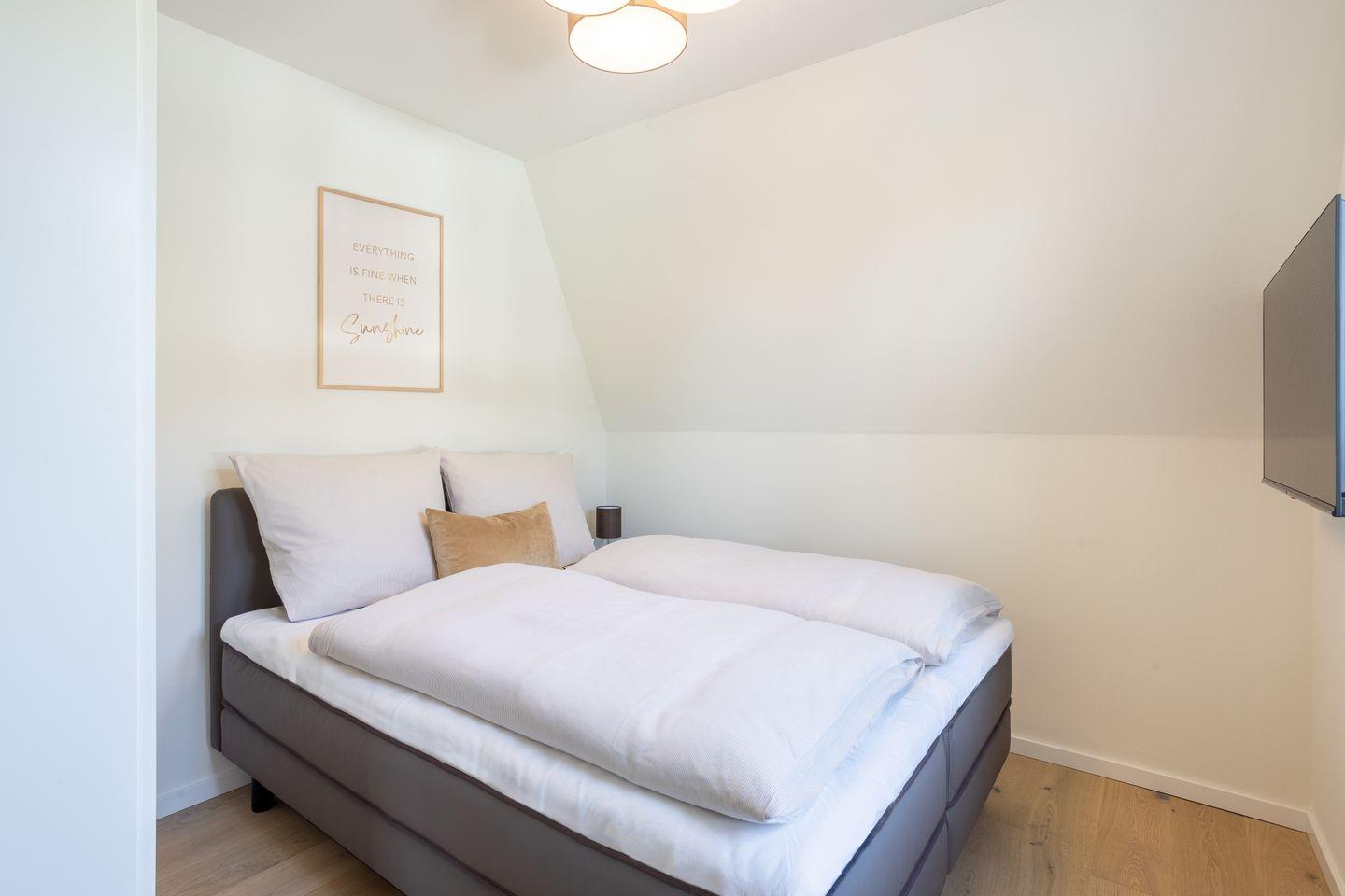 Zwei Schlafzimmer mit bequemen Boxspringbetten, Verdunkelungsplissees und jeweils eigenem TV bieten dir Rückzugsorte für erholsame Nächte. Auch ein Babybett findet hier problemlos Platz.