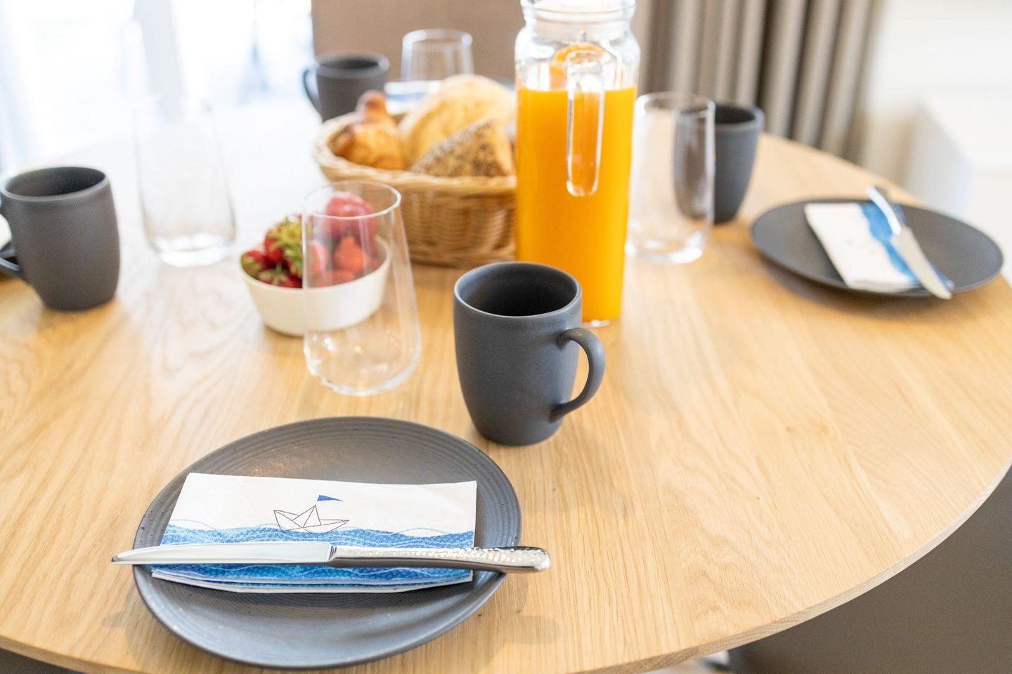 Der offene Wohnbereich lädt mit gemütlichem Sofa, Smart-TV und großen Fenstern zum Entspannen ein. Die moderne Küche ist bestens ausgestattet und bietet alles für das gemeinsame Kochen. Auf dem nordostseitigen Balkon genießt du frische Luft und ein Frühstück in der Morgensonne.