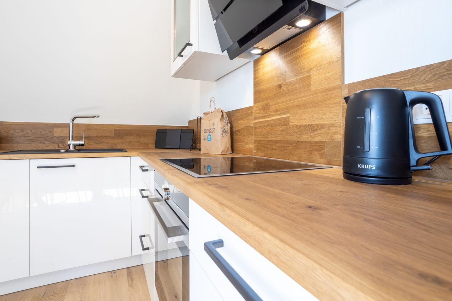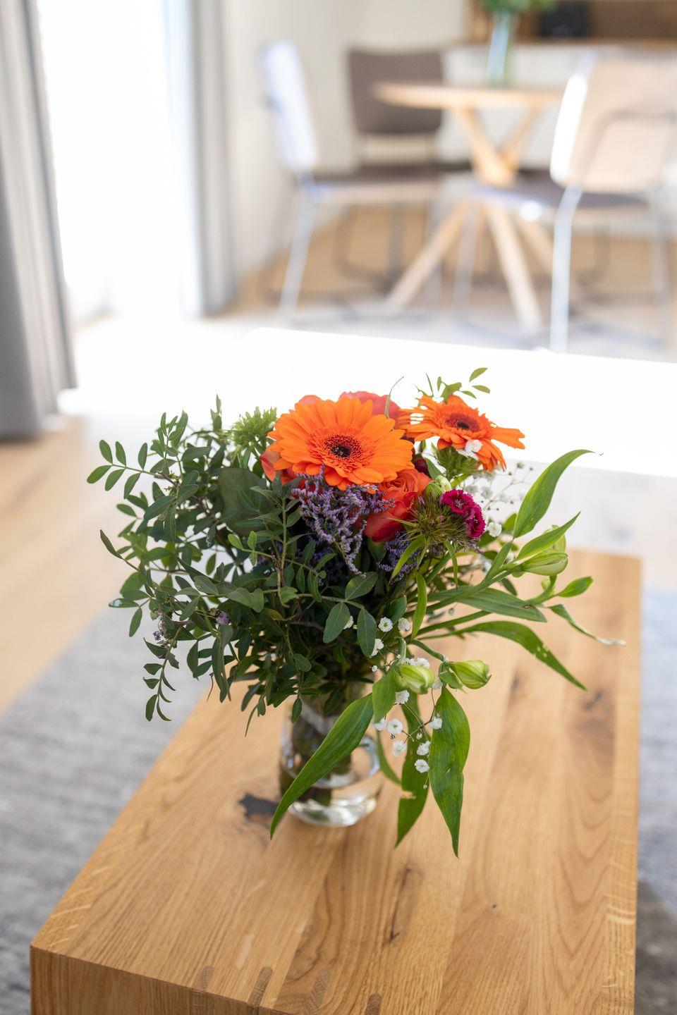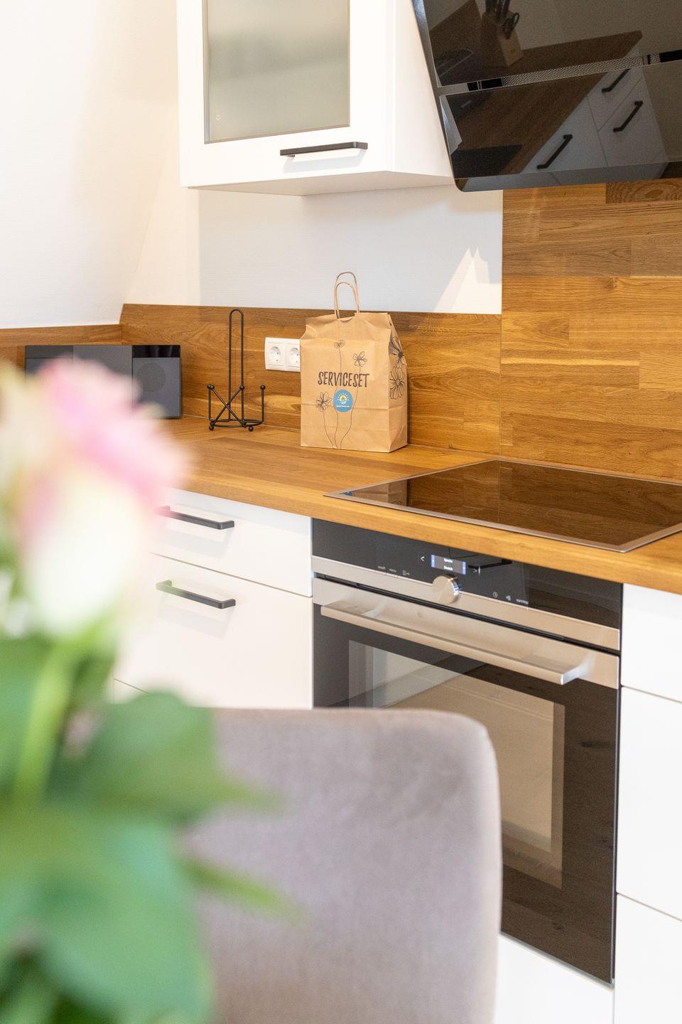 Der helle Wohnbereich mit gemütlicher Sitzlandschaft, Flachbild-TV und bodentiefen Fenstern schafft ein luftiges, offenes Raumgefühl. Die offene Küche ist voll ausgestattet – ideal für gemeinsame Kochmomente. Vom Wohnbereich aus gelangst du direkt auf den Südwest-Balkon, auf dem du die Abendsonne in vollen Zügen genießen kannst.