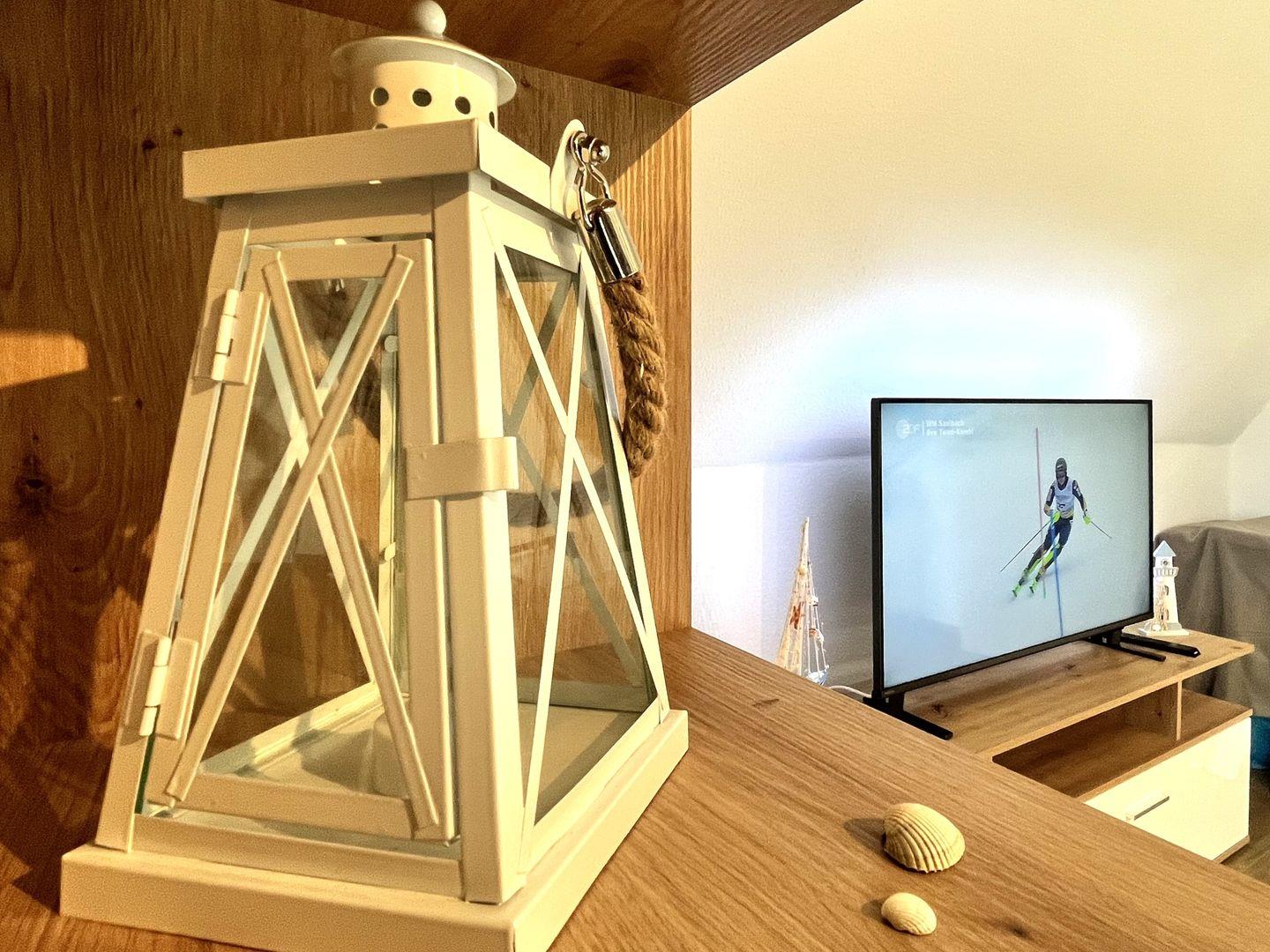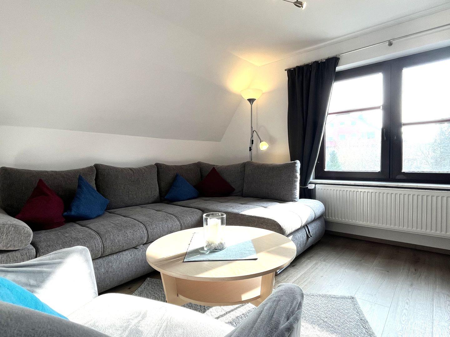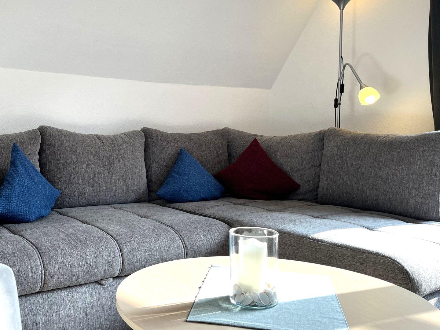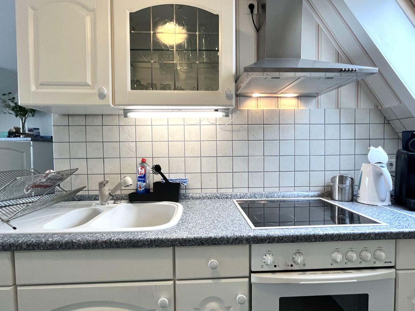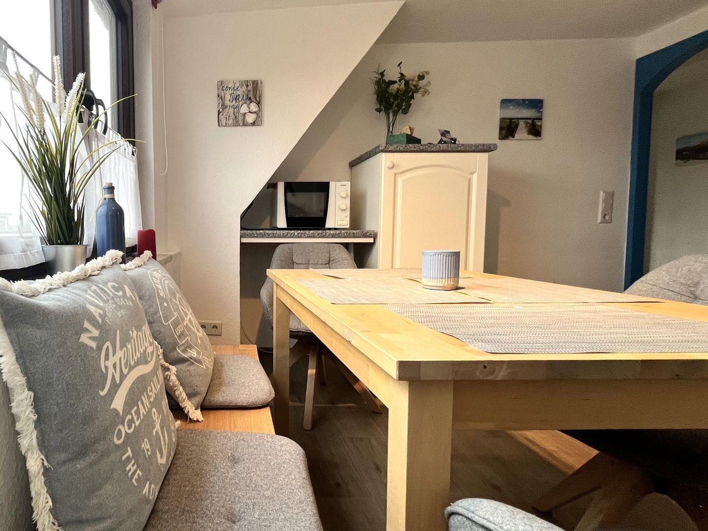 Der offene Wohnbereich mit integrierter Küche ist der Herzstück dieser Unterkunft. Hier finden Sie eine moderne Ausstattung, die keine Wünsche offenlässt. Die Küche ist mit einem Herd, Backofen, Kühlschrank sowie allen notwendigen Küchenutensilien ausgestattet. Auch eine Mikrowelle, eine Kaffeemaschine sowie Toaster und Wasserkocher stehen Ihnen zur Verfügung. Nach einem langen Tag können Sie sich hier am Esstisch gemeinsam stärken oder auf der bequemen Sofaecke entspannen und Ihre Lieblingssendungen auf dem großen digitalen Fernseher (35-44 Zoll) genießen. WLAN und Internetzugang sind ebenfalls vorhanden, sodass Sie auch im Urlaub stets verbunden bleiben.