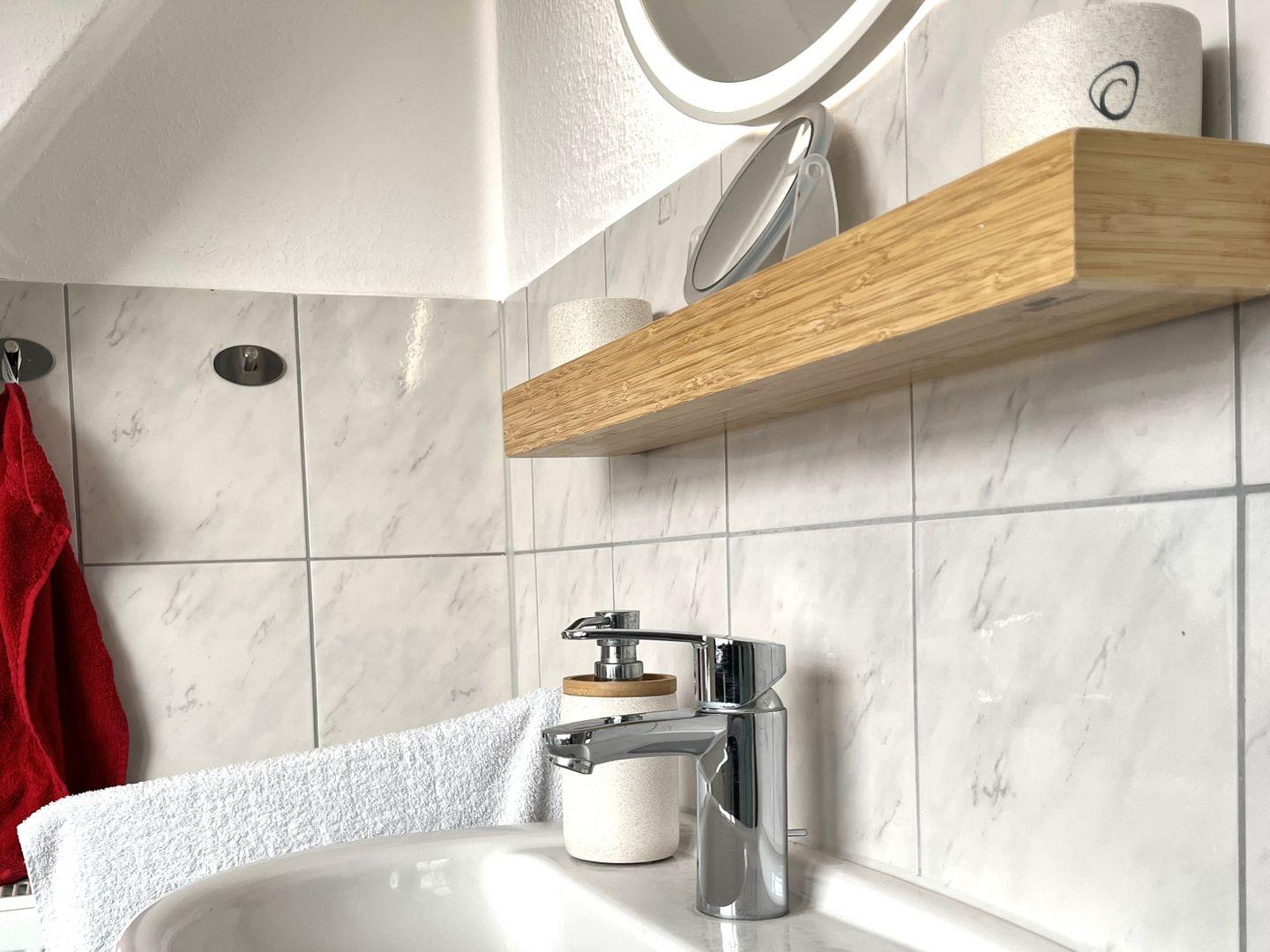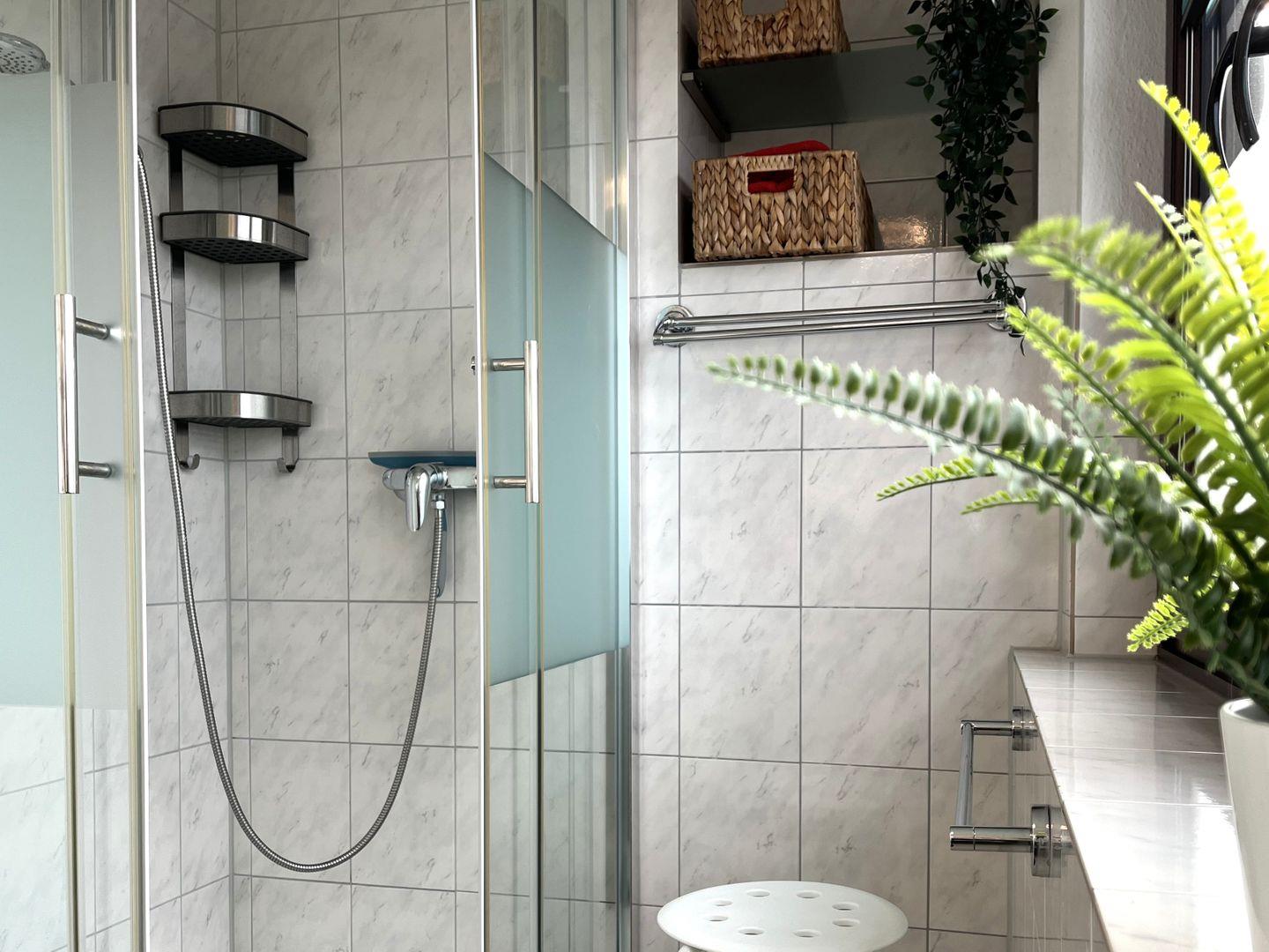 Das Badezimmer ist mit einer Dusche ausgestattet, die auch eine Badewanne beinhaltet, und es gibt einen Haartrockner sowie einen Spiegel für Ihre Bequemlichkeit. Für zusätzliche Sicherheit der Gäste sind Rauchmelder und Feuerlöscher vorhanden.