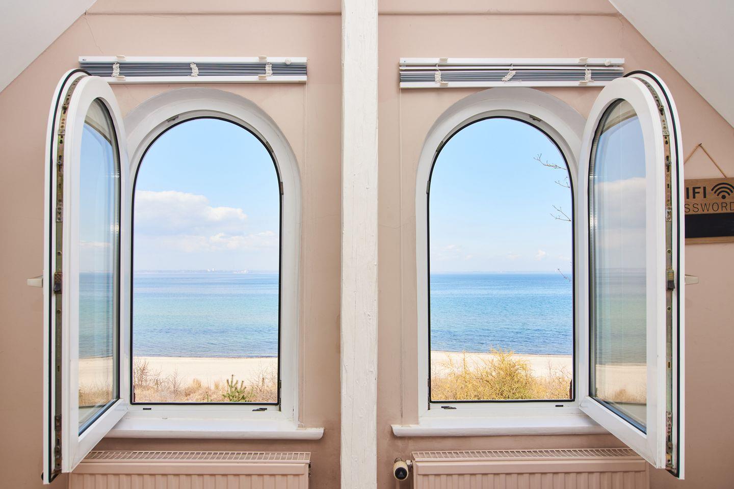 Das Doppelzimmer „Leuchtturm“ in der obersten Etage der Strandvilla bietet einen fantastischen Blick über die Ostsee und auf die Sonnenuntergänge. Das Zimmer besticht durch Dachschrägen und eine gemütliche Atmosphäre. Die Dusche und das Waschbecken befinden sich im Raum, die Toilette ist separat. Eine Gemeinschaftsküche steht zur Mitnutzung bereit.