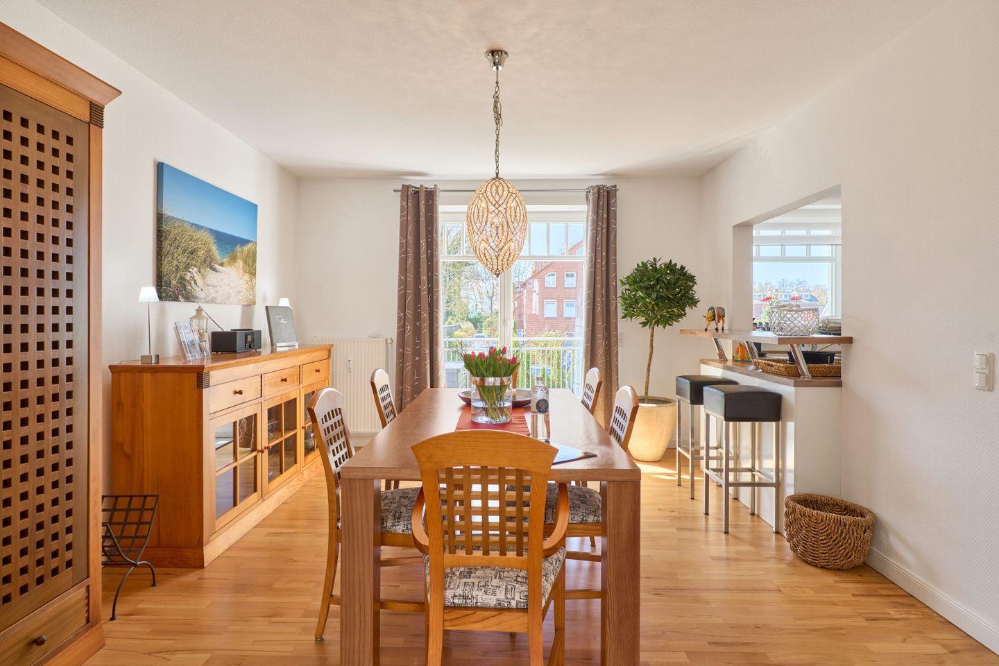 Das Herzstück der Wohnung ist der offen gestaltete Wohn- und Essbereich. Hier trifft modernes Design auf wohnliche Gemütlichkeit. Der helle Raum verbindet Kochen, Essen und Entspannen auf harmonische Weise – perfekt für gemeinsame Urlaubsmomente. Im Wohnbereich stehen Ihnen ein Smart-TV, ein BluRay-Player sowie ein Radio mit Bluetooth-Funktion zur Verfügung. Gesellschaftsspiele für verschiedene Altersgruppen sorgen für Unterhaltung bei jedem Wetter. Die offene Küche ist voll ausgestattet mit einer Filterkaffeemaschine, einer Nespresso-Kafffeemaschine, einer Special.T-Teemaschine (inkl. zwei Begrüßungstabs), einem Geschirrspüler, einer Mikrowelle sowie einer Kühl-/Gefrierkombination. Auch ein Bügeleisen mit Bügelbrett ist vorhanden.