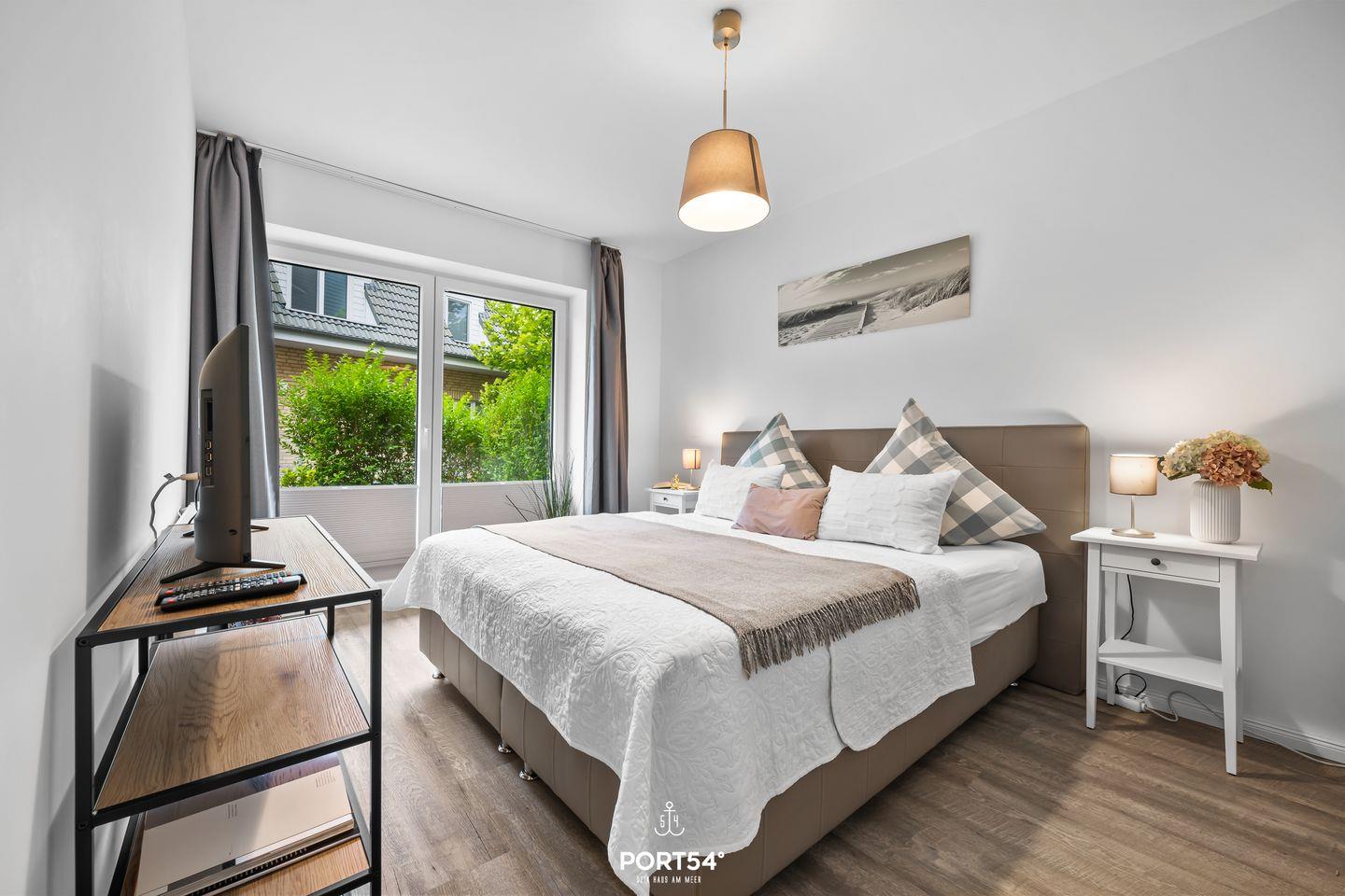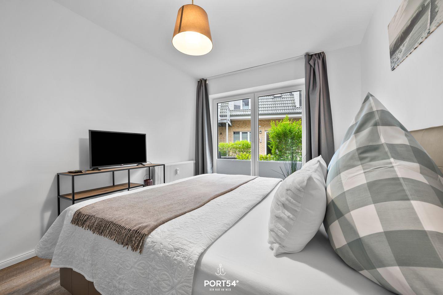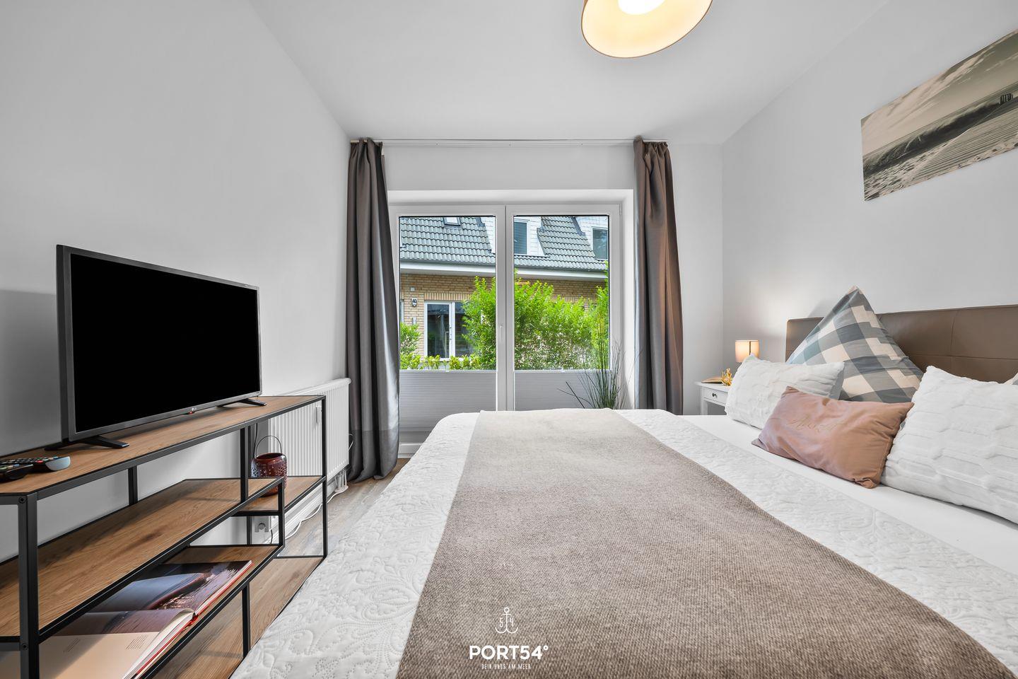 Der Schlafbereich ist ebenso durchdacht gestaltet: Ein Schlafzimmer mit komfortablem Doppelbett, Kleiderschrank und Fernseher steht bereit, während die Schlafcouch im Wohnzimmer zusätzliche Schlafmöglichkeiten für einen Erwachsenen oder zwei Kinder bietet. Das moderne Badezimmer ist mit Dusche, Haartrockner und Kosmetikspiegel ausgestattet.