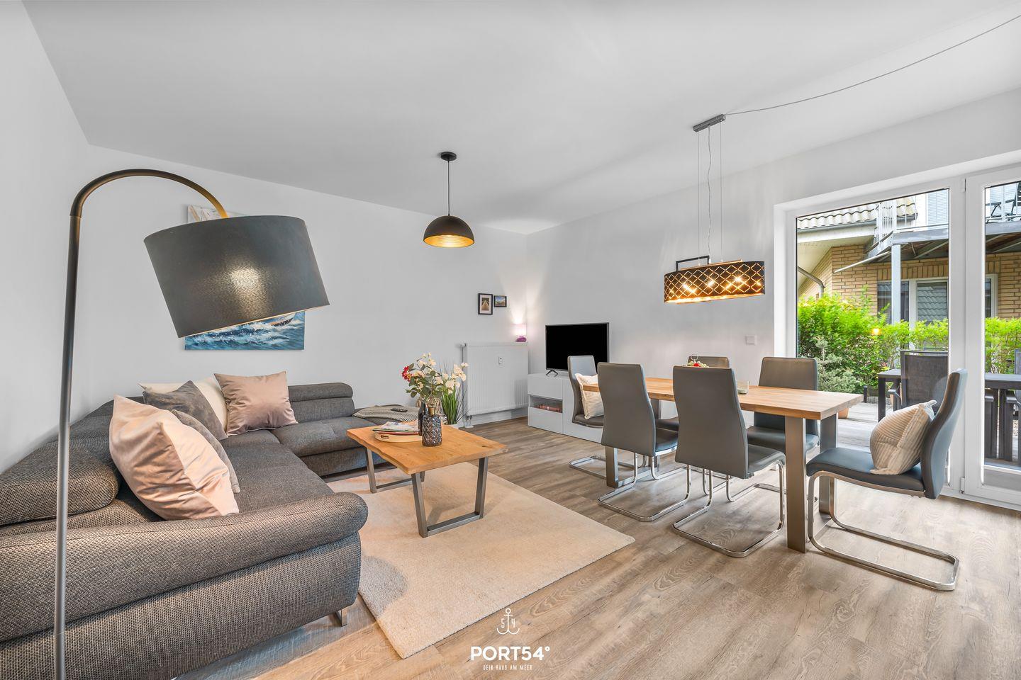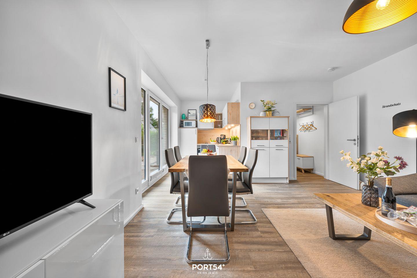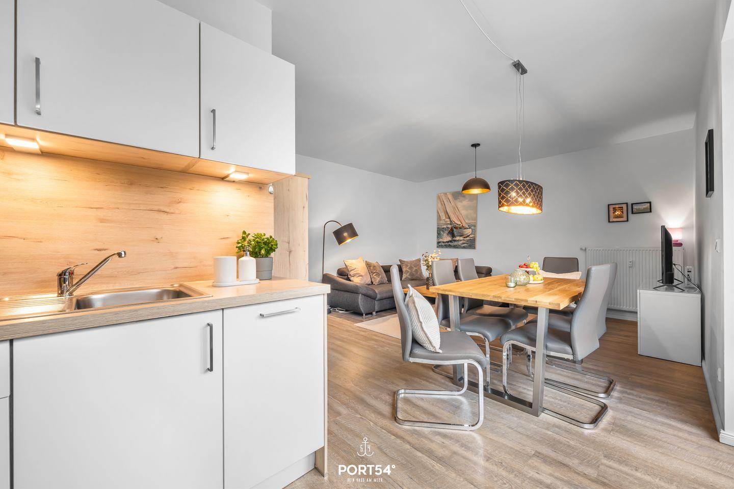 Die Ferienwohnung überzeugt mit einem modernen und freundlichen Ambiente, das zum Verweilen einlädt. Der großzügige Wohnbereich ist mit einem gemütlichen Sofa, einem Essbereich und einem Fernseher ausgestattet – ideal für entspannte Familienabende. Die offene Küche grenzt direkt an den Wohnraum und lässt keine Wünsche offen: Herd, Backofen, Spülmaschine und Filterkaffeemaschine sind vorhanden, ebenso wie alle notwendigen Küchenutensilien, Geschirr und Besteck. So kannst du sofort mit dem Kochen beginnen.
