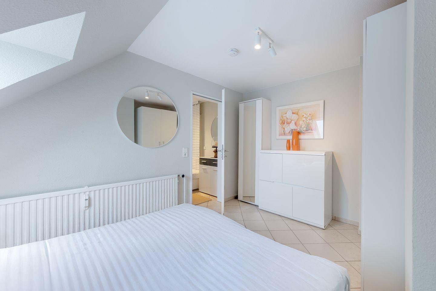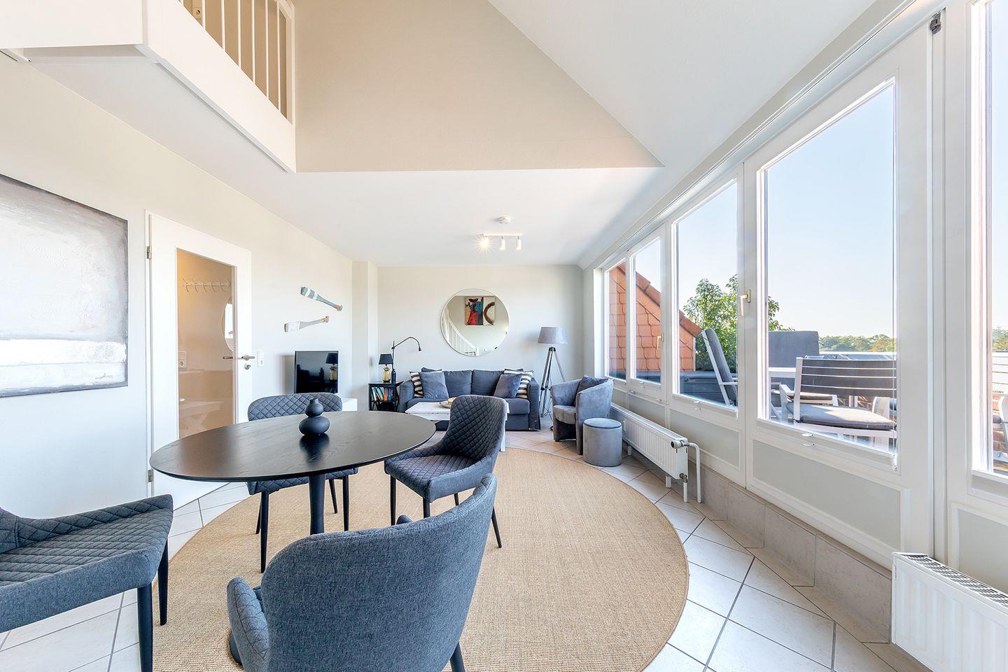 Die moderne, rund 50 m² große Ferienwohnung erstreckt sich über zwei Ebenen und bietet Platz für bis zu vier Personen. Der helle Wohnbereich mit gemütlicher Essecke, Smart-TV und separater Küche schafft die perfekte Umgebung für entspannte Urlaubstage. Auf der oberen Etage erwarten Sie ein gemütliches Schlafzimmer mit komfortables Doppelbett sowie eine Galerieebene mit zusätzlichem Einzelbett.