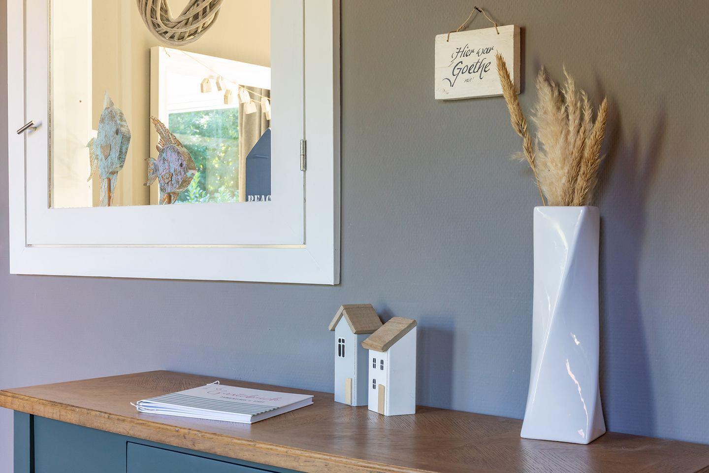 Auf ca. 100 m² Wohnfläche bietet das Haus viel Platz für Familie und Freunde. Im Erdgeschoss betreten Sie die offene, großzügige Diele, die Zugang zur Küche, zum Essbereich und zum Wohnbereich bietet. Die moderne Küche ist mit Gaskochfeld, Backofen, Gefrierkombination, Geschirrspüler und Mikrowelle ausgestattet. Der Wohnbereich besticht durch seine große Fensterfront, eine gemütliche Couchgarnitur und Flatscreen-TV sowie den Blick in den Garten, der zu entspannten Stunden einlädt. Außerdem befinden sich im Erdgeschoss ein Duschbad, ein Hauswirtschaftsraum und das erste Schlafzimmer mit hochwertigem Boxspringbett, Flatscreen-TV und direktem Zugang zur Terrasse.
