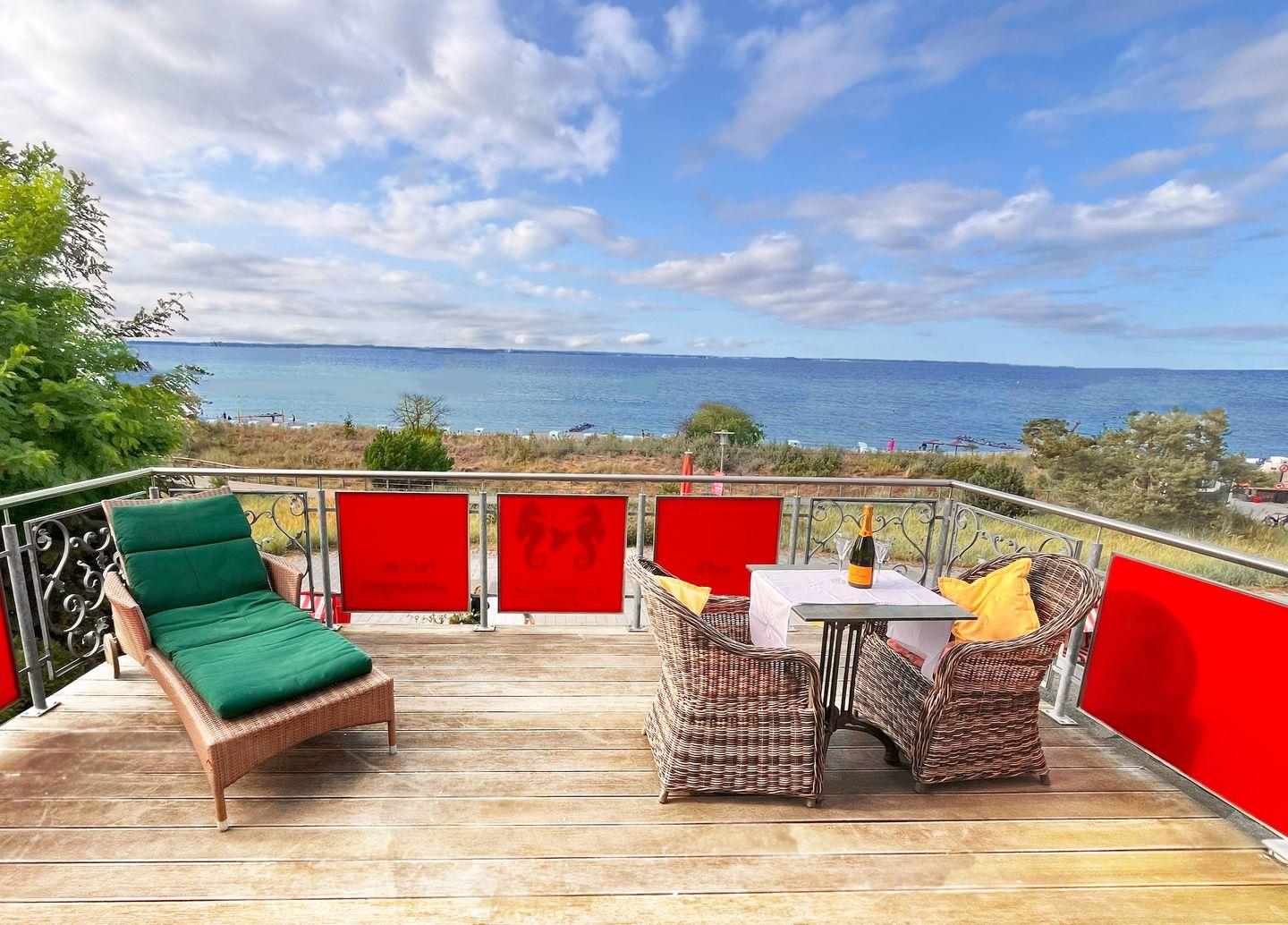 Zwei Balkone laden zum Entspannen ein: Der offene Balkon bietet einen weiten Blick über die Ostsee, hier lassen sich die beeindruckenden Sonnenauf- und Sonnenuntergänge in vollen Zügen genießen, während der überdachte Südbalkon besonders windgeschützt ist – ideal für ruhige Stunden im Freien.
