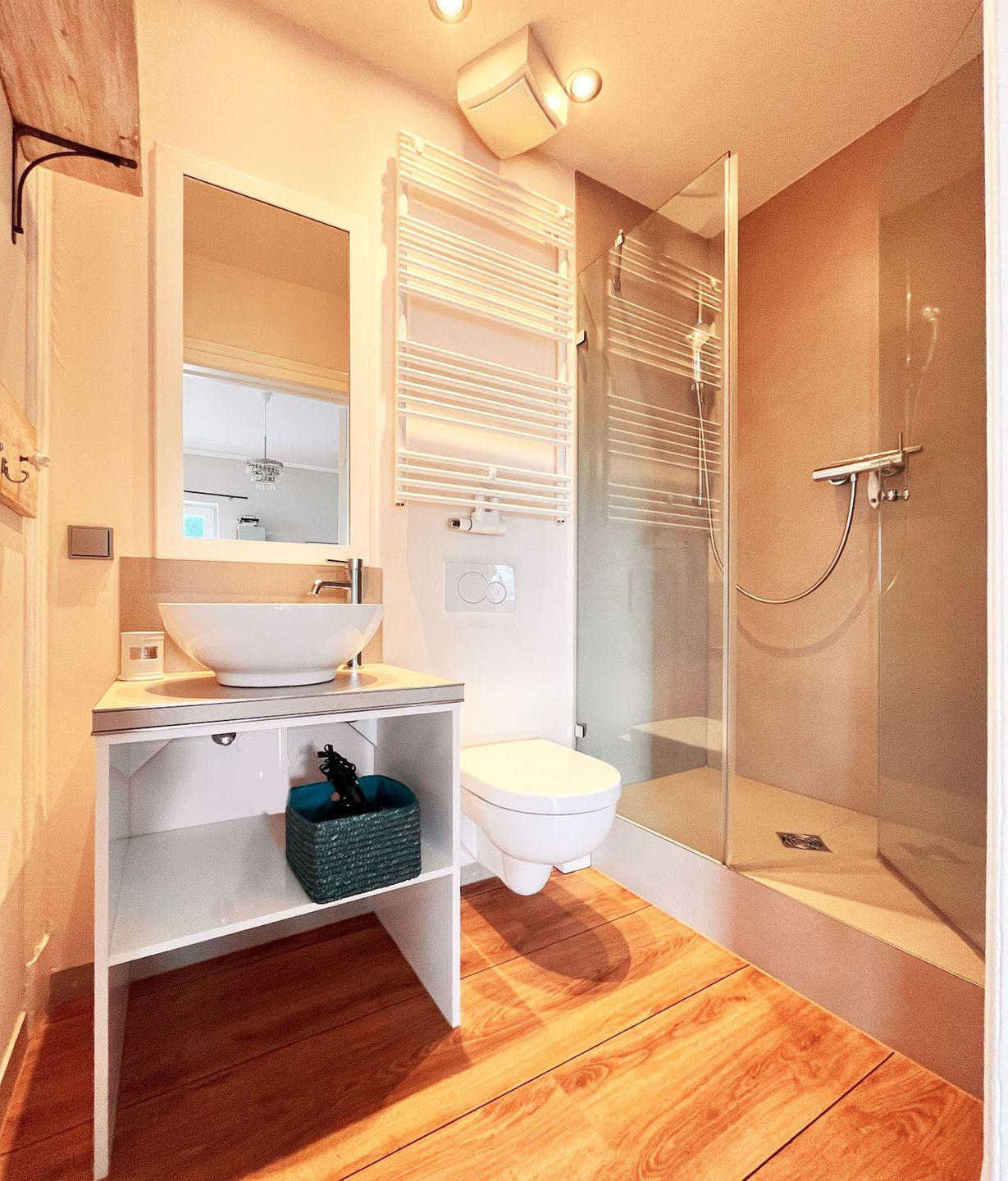 Die Wohnung Beletage im 1. OG ist über eine Außentreppe am Haus erreichbar und überzeugt durch einen hellen, großzügigen Wohnbereich mit viel Tageslicht sowie einem unvergleichlichen Blick auf die Ostsee. Der Wohnbereich verfügt über eine integrierte, gut ausgestattete Küche und lädt zum gemeinsamen Kochen und Verweilen ein. Das Schlafzimmer ist durch eine Glasschiebewand vom Wohnraum getrennt, sodass sich der Blick unvermittelt über die Ostsee öffnet. Die originalen Pitchpineböden unterstreichen den historischen Charakter der Villa und schaffen eine warme, gemütliche Atmosphäre. Hohe Decken und charmante historische Details runden das Ambiente ab. Ein modernes Badezimmer ergänzt den Komfort.