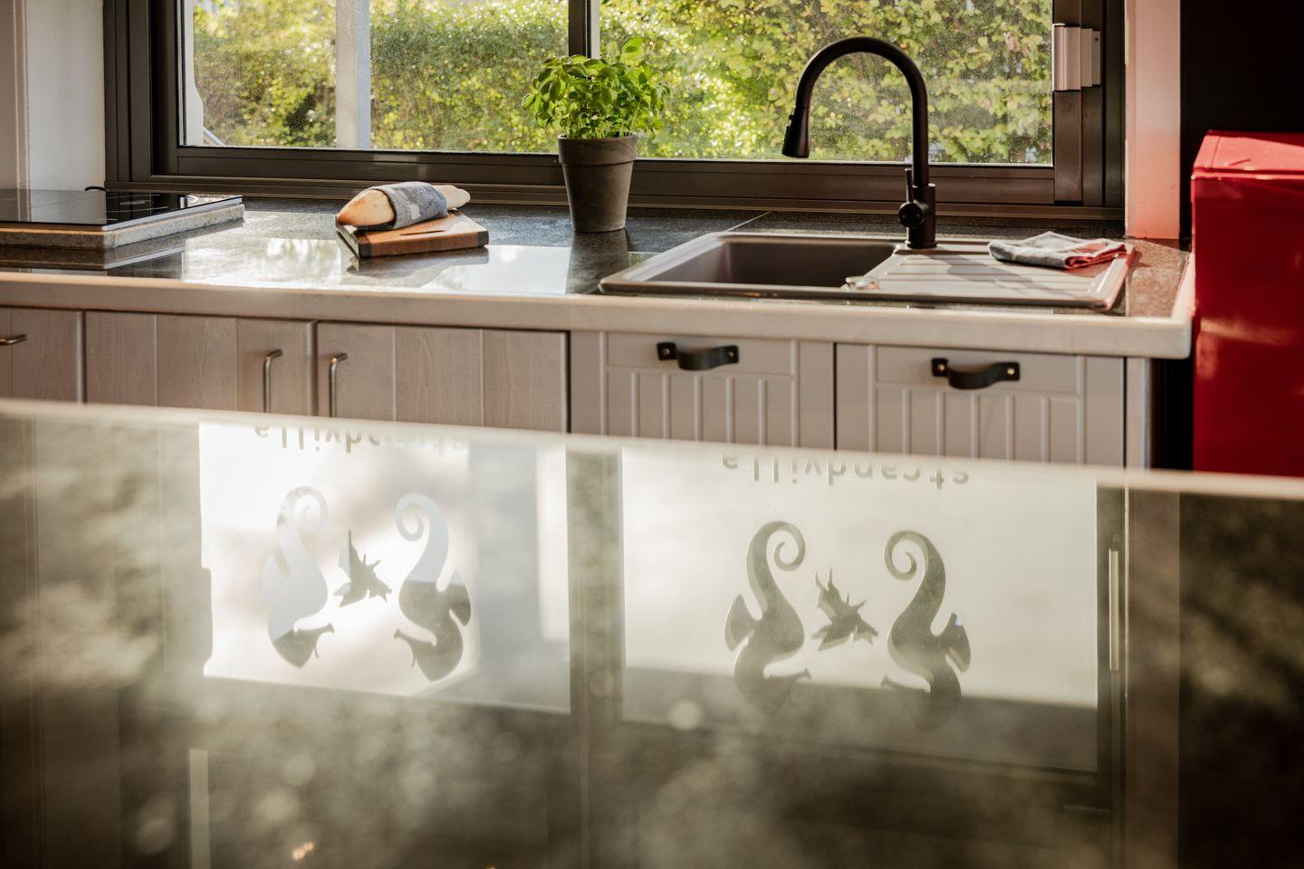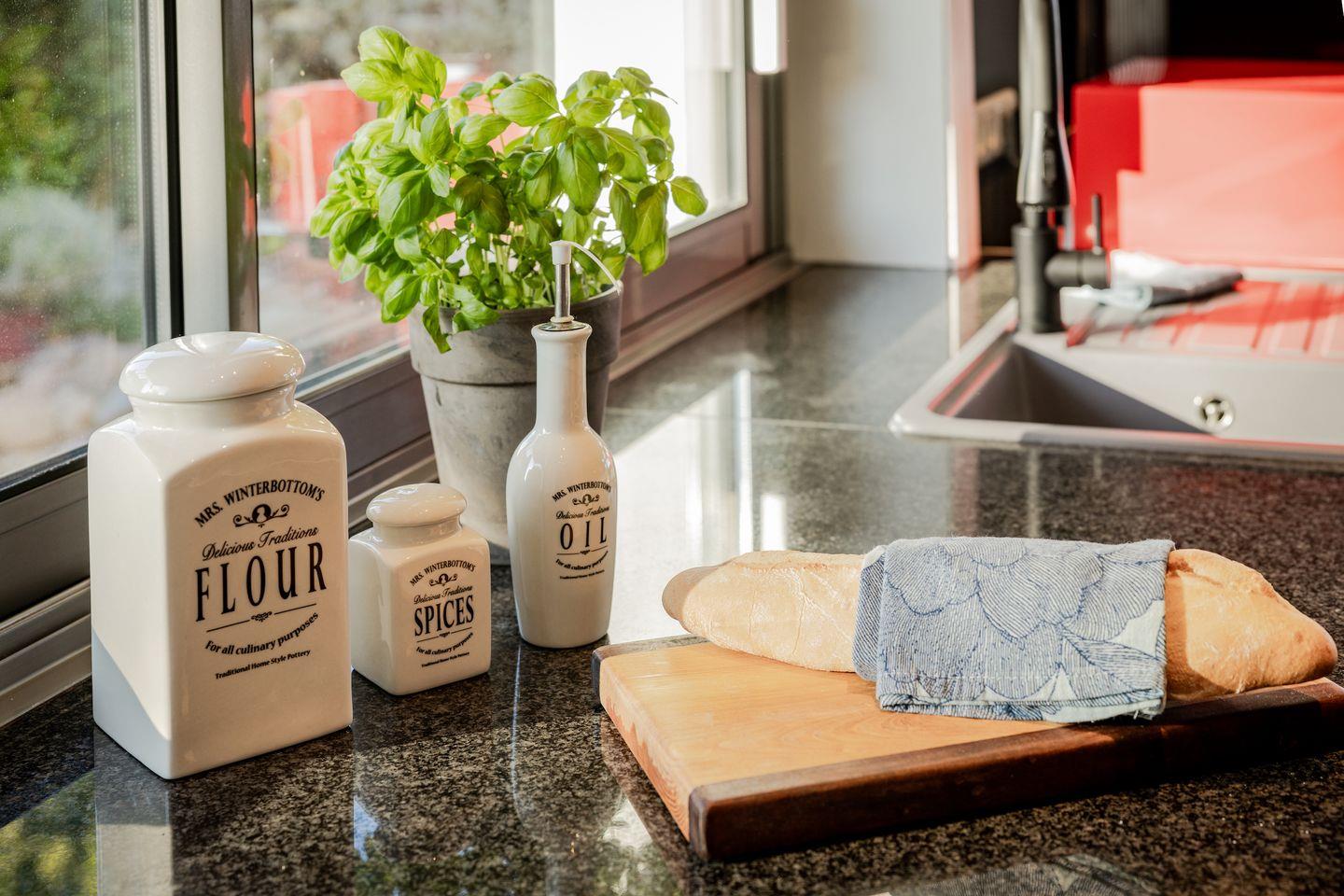 Die voll ausgestattete Küche ist in den Wohnbereich integriert und bewahrt Elemente aus dem ehemaligen Café, die ihr einen besonderen historischen Charme verleihen. Das Schlafzimmer bietet ein komfortables Boxspringbett für erholsame Nächte, während das Badezimmer Komfort verspricht.
