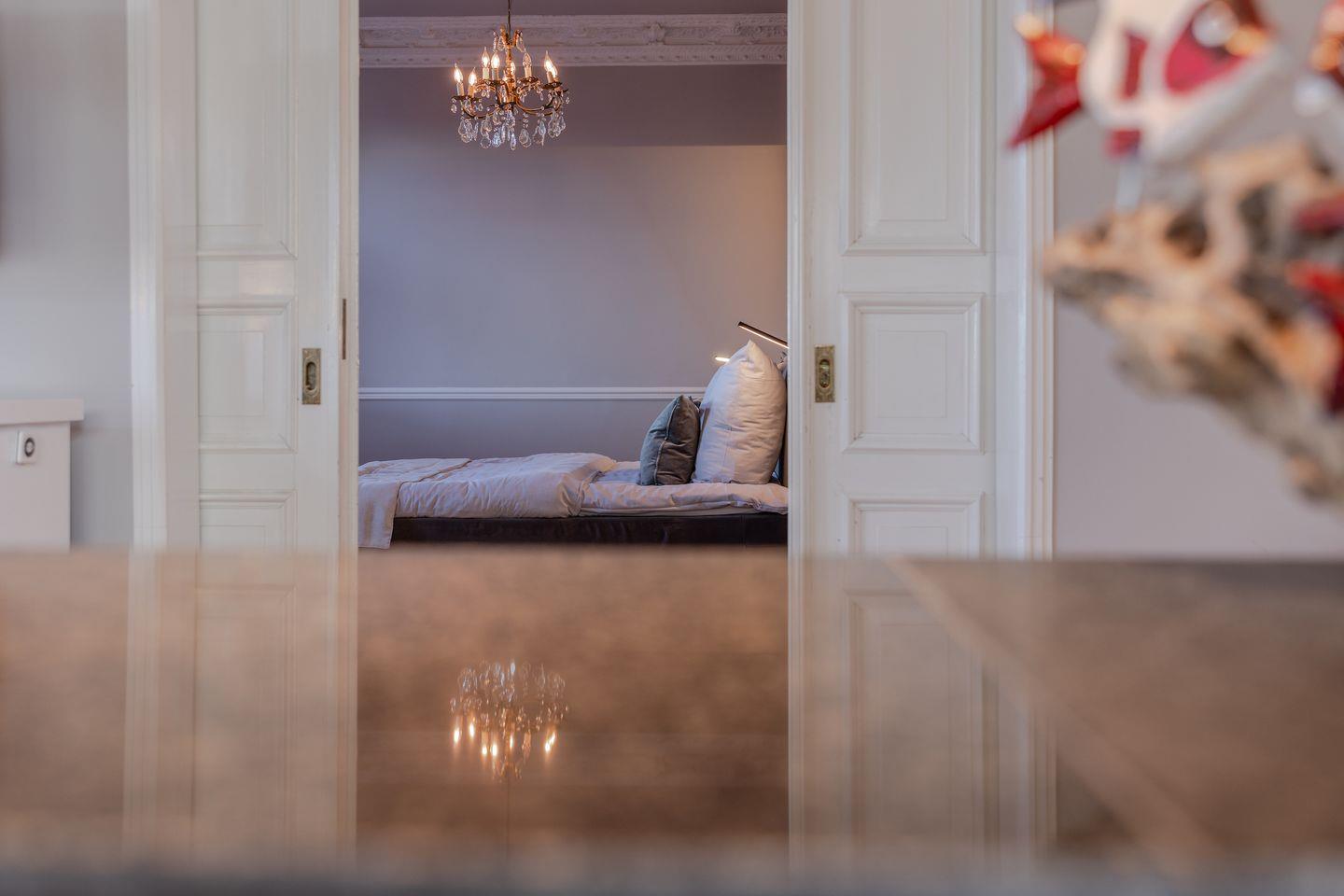 Hohe Decken, kunstvoller Stuck, ein eleganter Kronleuchter und warme Pitchpineböden prägen das Appartement und schaffen ein einzigartiges Wohngefühl. Sowohl Wohn- als auch Schlafzimmer bieten einen direkten Blick auf die Ostsee. Der elektrisch betriebene Kamin im Wohnzimmer, bequem per Fernbedienung steuerbar, sorgt für besonders gemütliche Stunden.