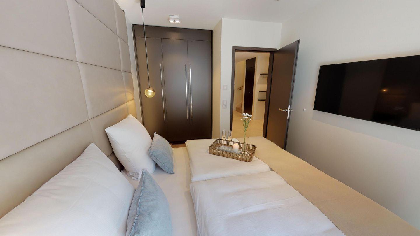 Im Untergeschoss befinden sich zwei Schlafzimmer mit Boxspring-Doppelbetten - beide Schlafzimmer haben Zugang zur großen, möblierten Terrasse. Ergänzt wird das Untergeschoss durch ein modernes Badezimmer mit Dusche sowie eine eigene Sauna (2,37m × 1,19m) im Flur. Im Erdgeschoss erwartet Sie eine offene, gut ausgestattete Küchenzeile mit anschließender Essecke. Abgerundet wird der Wohnbereich durch ein gemütliches Sofa sowie Sessel. Des Weiteren gibt es ein Gäste-WC.