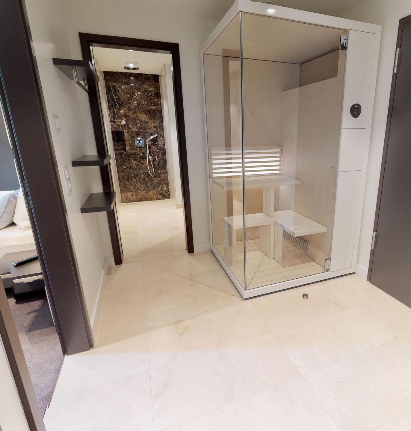 Im Untergeschoss befinden sich zwei Schlafzimmer mit Boxspring-Doppelbetten. Beide Schlafzimmer haben Zugang zur großen, möblierten Terrasse mit Sonnenliegen. Das Untergeschoss wird durch ein modernes Badezimmer mit Dusche und eine eigene kleine Sauna (1,17m x 1,17m) ergänzt.