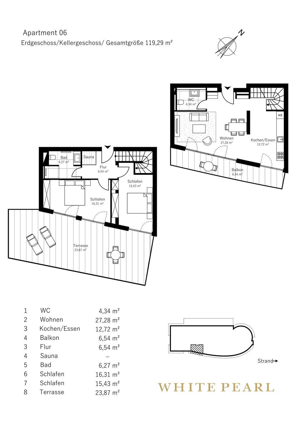 Die Luxussuite 0.06 im Erdgeschoss des "White Pearl" erstreckt sich über zwei Etagen und bietet auf 119 m² Platz für 5 Personen – auch Ihr Hund ist willkommen. Die Suite verfügt über zwei separate Schlafzimmer sowie ein Schlafsofa im Wohnbereich für eine Person.