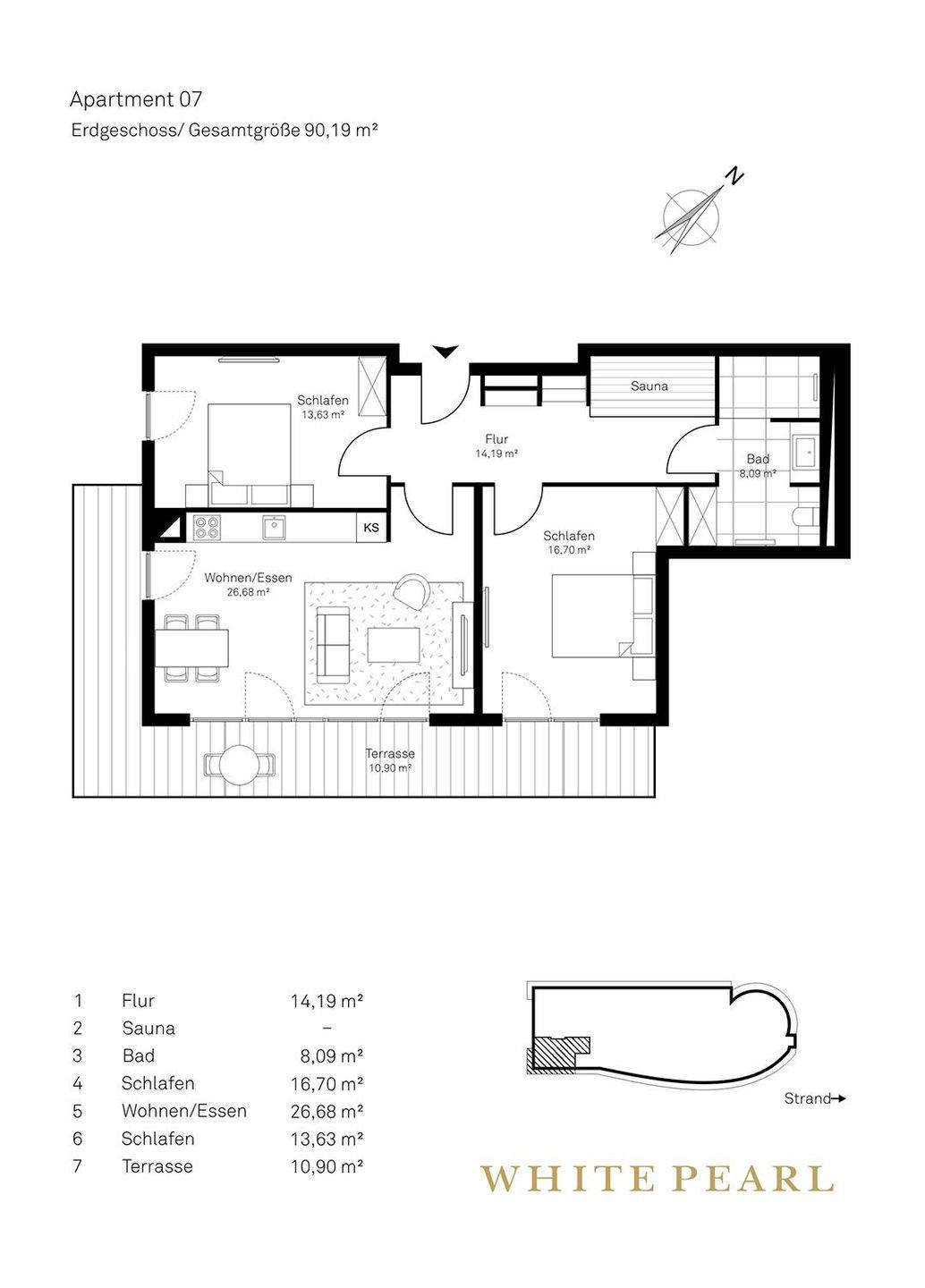 Wenige Minuten vom Strand entfernt befindet sich die Luxussuite 0.07 im Erdgeschoss des "White Pearl" und bietet auf 90 m² Platz für 5 Personen – auch Ihr Hund ist willkommen. Die Suite verfügt über zwei separate Schlafzimmer sowie ein Schlafsofa im Wohnbereich für eine Person.
