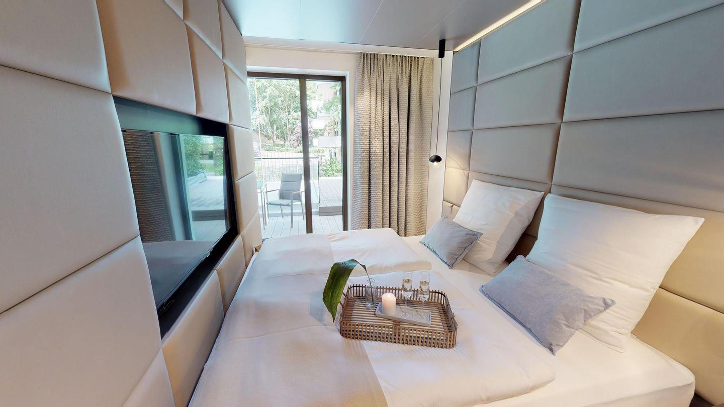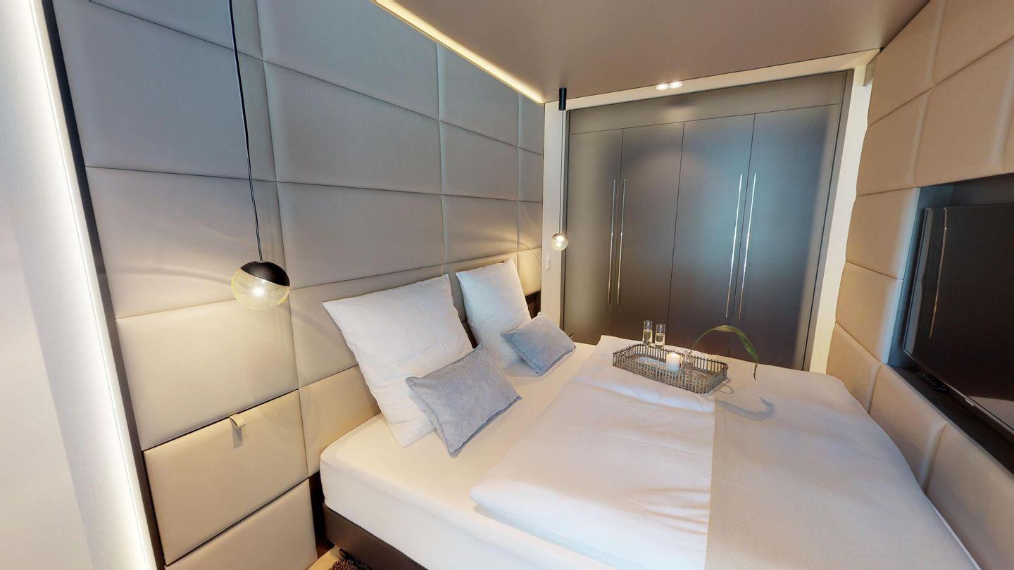 Es erwartet Sie eine gut ausgestattete Küchenzeile mit einer Essecke im Wohnbereich. Des Weiteren gibt es ein modernes Bad mit Dusche. Ein Haltegriff in der Dusche ist vorhanden. Abgerundet wird der offene Wohn- Essbereich durch das komfortable Sofa, welches eine Schlafmöglichkeit für 2 Personen bietet. Das separate Schlafzimmer mit Boxspring-Doppelbett wird durch Lamellen-Schiebetüren abgetrennt.