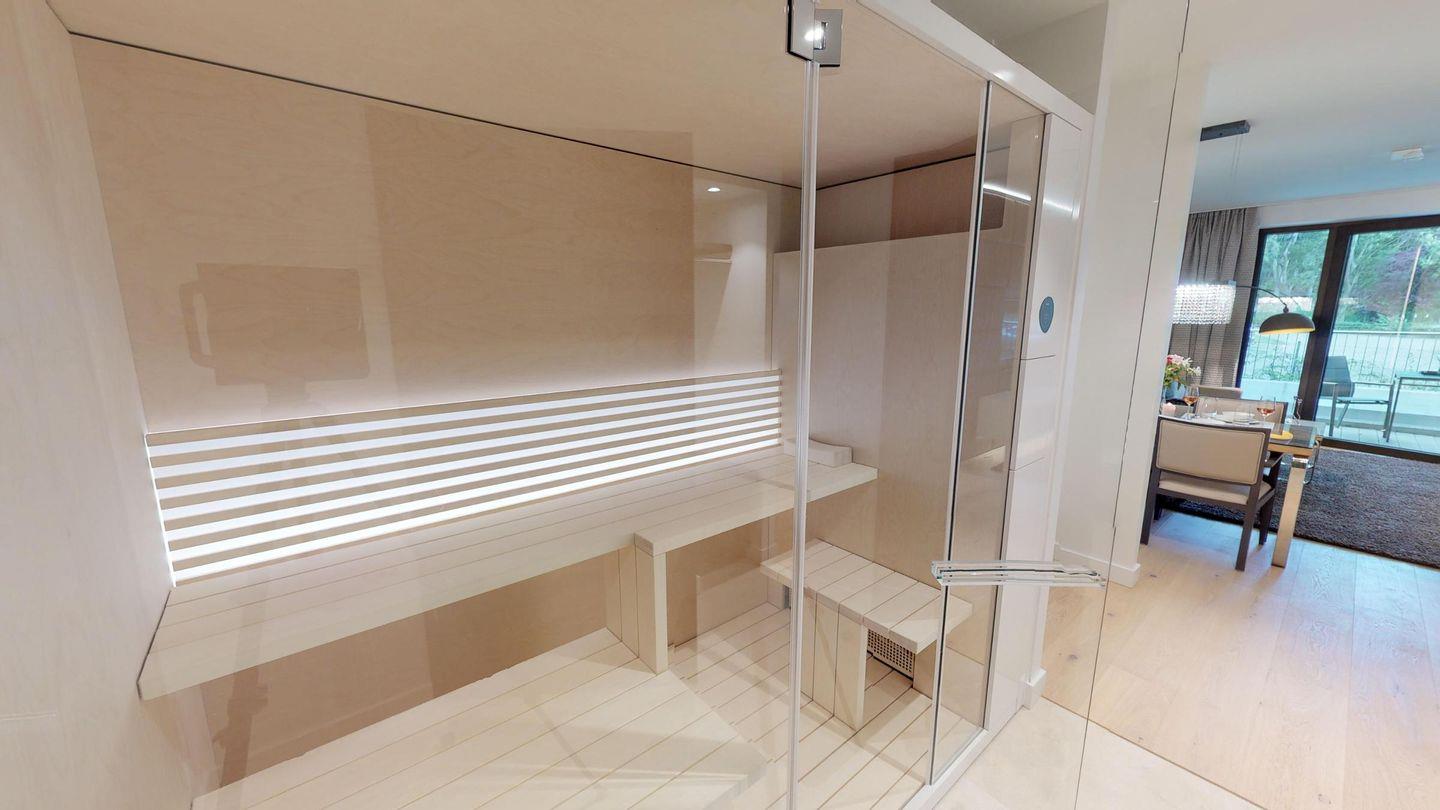 Highlights des Apartments sind die eigene Sauna (2,37m x 1,19m) sowie der überdachte Balkon, der entspannte Stunden an der frischen Luft ermöglicht! Zur Wohnung gehört ein Außenstellplatz. Diese Wohnung ist barrierefrei gem. LBO.