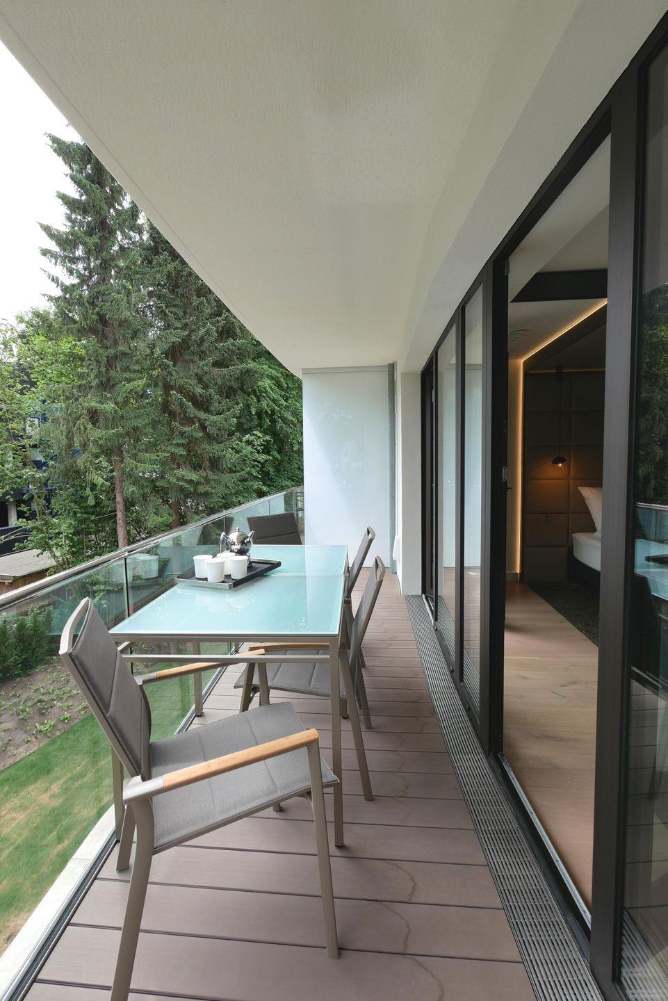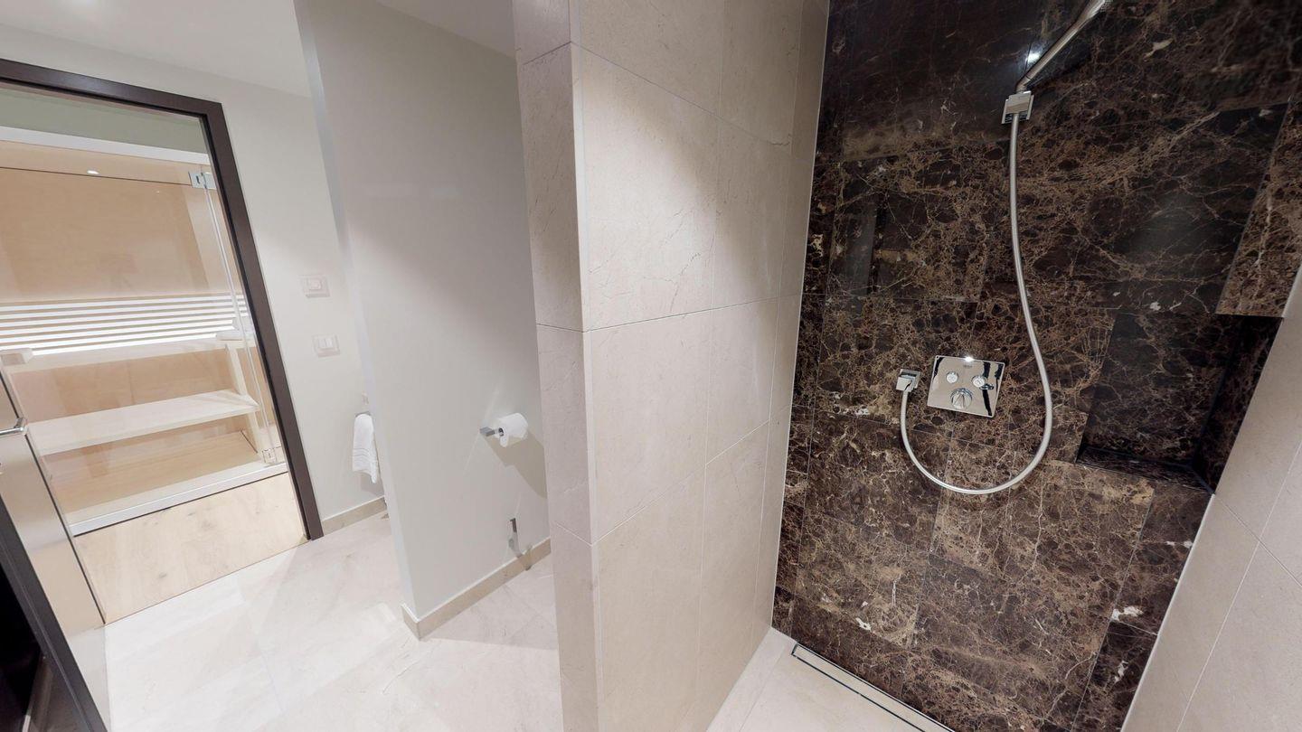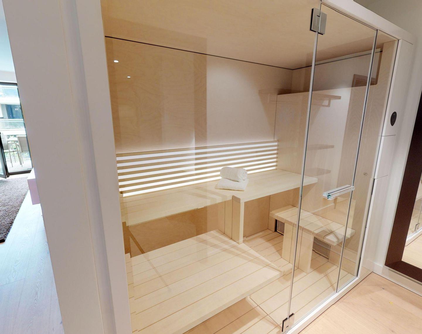 Sie erwartet eine gut ausgestattete Küchenzeile mit einer Essecke im Wohnbereich. Darüber hinaus gibt es ein modernes Badezimmer mit Dusche. Der offene Wohn- und Essbereich wird durch eine gemütliche Couch abgerundet, die als Schlafplatz für zwei Personen genutzt werden kann. Das separate Schlafzimmer verfügt über ein Boxspring-Doppelbett, das durch Lamellen-Schiebetüren abgetrennt werden kann. Abgerundet wird das Apartment durch die eigene Sauna (2,37m x 1,19m).