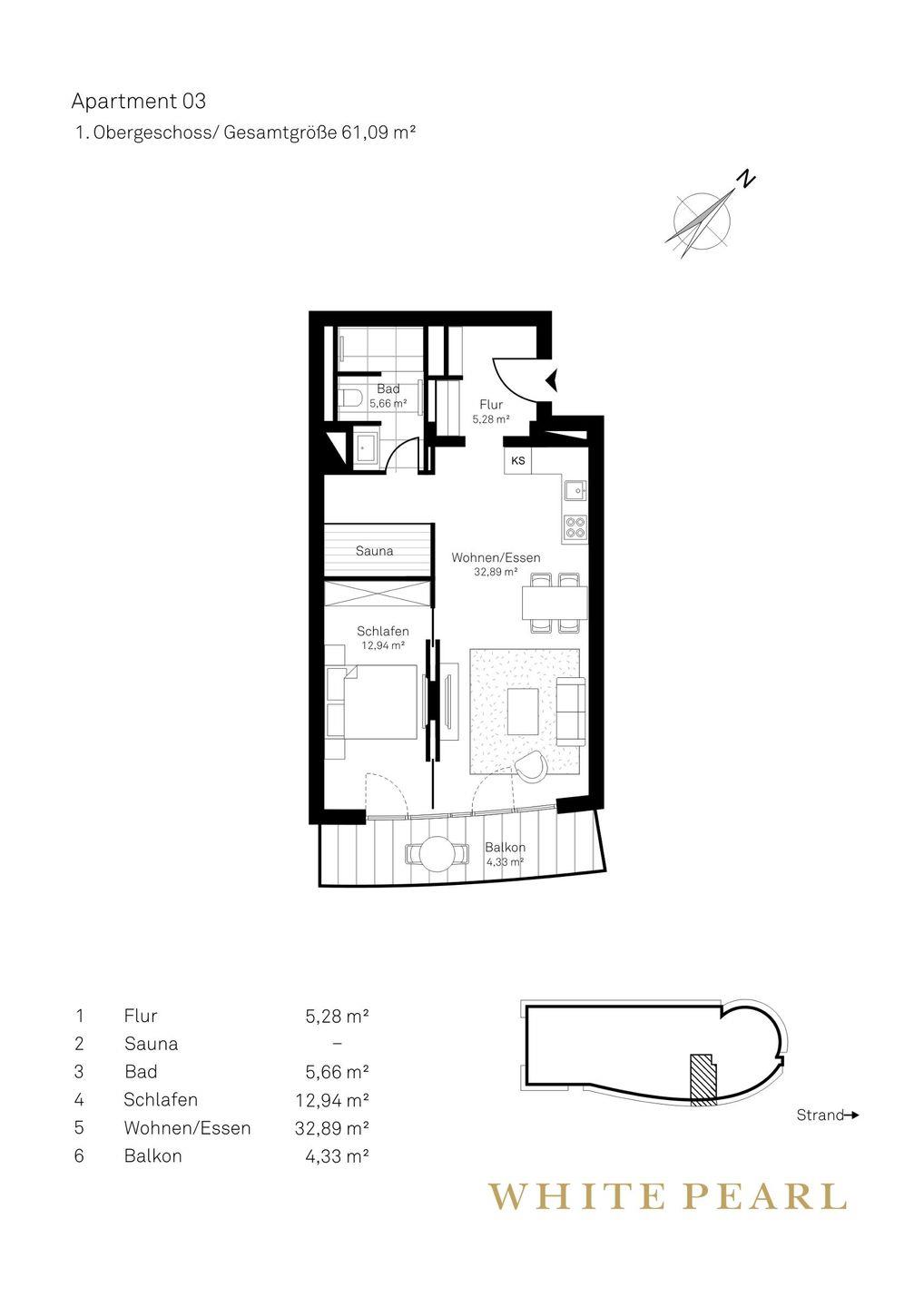 Nur wenige Minuten vom Strand entfernt befindet sich das Luxusapartment 1.03 im 1. Obergeschoss des "White Pearl" und bietet auf 61 m² Platz für 4 Personen. Das Apartment verfügt über ein separates, offenes Schlafzimmer sowie ein Schlafsofa im Wohnbereich für zwei Personen.