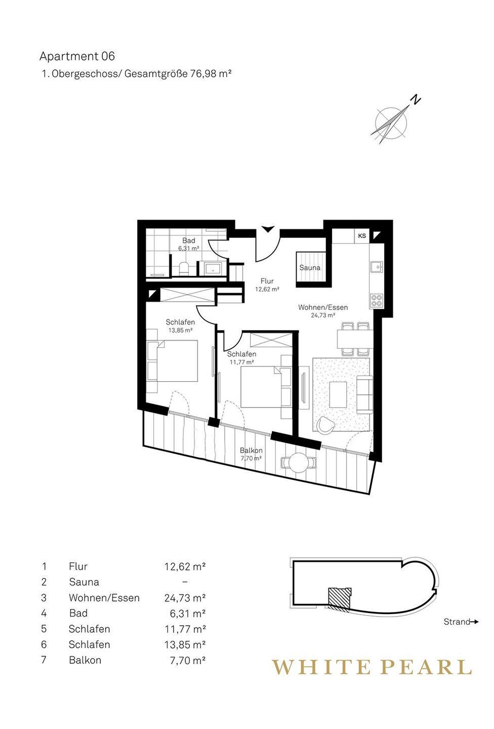 Highlights der Suite sind die eigene kleine Sauna (1,17m x 1,17m) sowie der möblierte Balkon, der entspannte Stunden an der frischen Meeresluft ermöglicht! Zur Wohnung gehört ein Tiefgaragenstellplatz.