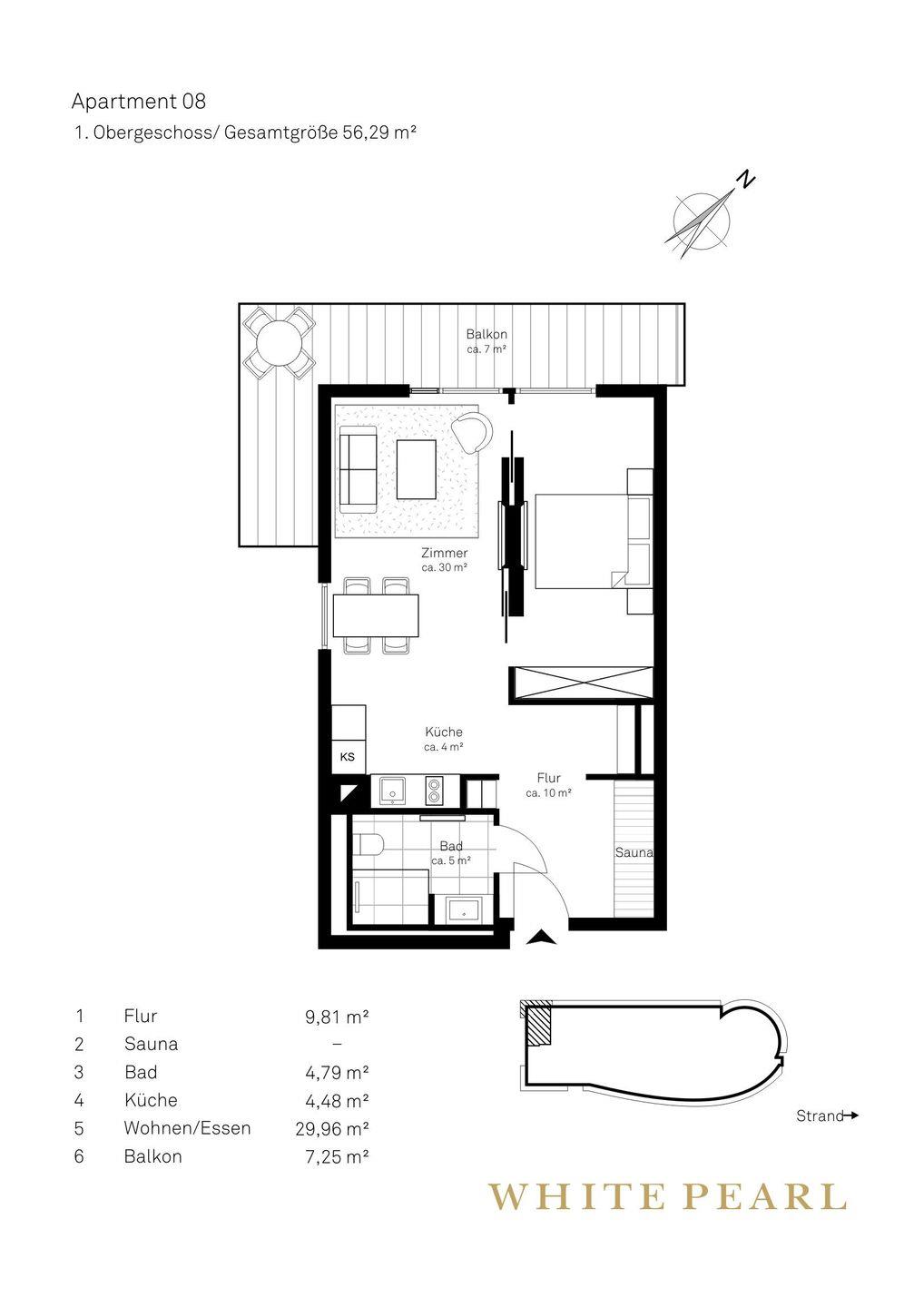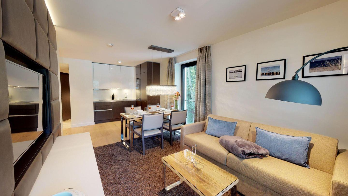 Nur wenige Meter vom Strand entfernt befindet sich das Luxusapartment 1.08 im 1. Obergeschoss des "White Pearl" und bietet auf 57 m² Platz für 4 Personen. Die Wohnung verfügt über ein separates, offenes Schlafzimmer sowie ein Schlafsofa im Wohnbereich für zwei Personen.
